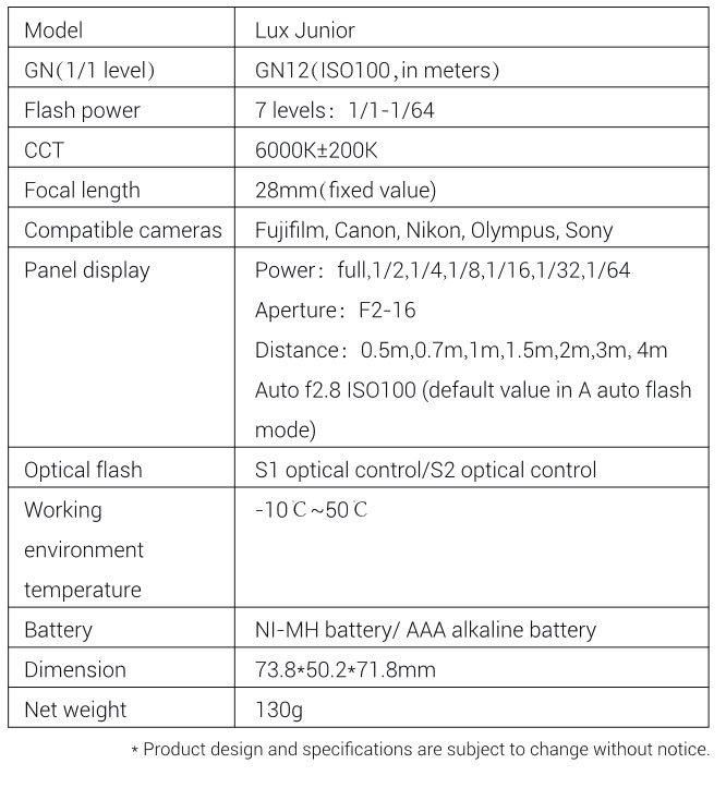 Godox Lux Junior är en enkel och elegant kamerablixt i retrodesign. Blixten kan användas både manuellt (med manuellt ställbar effekt) eller i ett enkelt Autoläge, som fungerar som kamerablixtar gjorde förr i tiden. Blixten har ett ledtal på 12 (ISO 100 på 1 meter) och en ljusspridning som motsvarar 28mm i brännvidd. Blixten har även en optisk slavsensor (S1/S2), som triggar blixten om sensorn träffas av blixtljus från en annan blixt. På ovansidan av blixten finns en test-knapp, som även indikerar när blixten är klar att avfyras. Det finns även ett synk-uttag på sidan av blixten. Blixten har standard blixtfot och är kompatibel med Canon, Nikon, Pentax, Fuji, Olympus, Sony och alla andra kameror med standard blixtsko och mittstift. (Blixten är ej kompatibel Canon EOS 2000D/ 4000D). Blixten drivs av 2 st AAA-batterier (ingår ej).