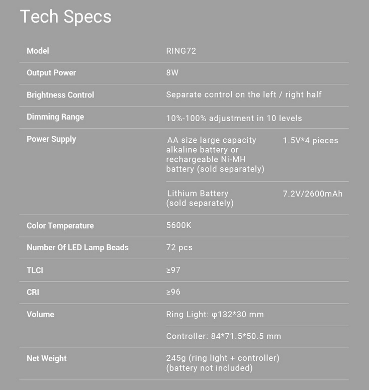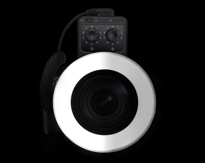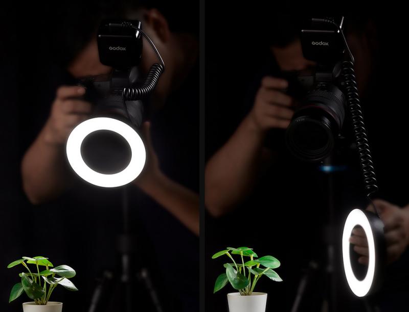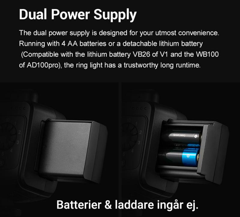 Ringbelysningen är utrustad med A/B-funktion, som gör det möjligt att ställa in olika effekt på vänster- och höger halva av ringbelysningen för att framhäva motivets former. Effekten är alltså individuellt ställbar på vänster- och höger halva av ringbelysningen. LED-belysningen är väldigt kompakt, eftersom strömförsörjningen och elektroniken sitter i ringbelysningens kontrollenhet, som monteras i kamerans blixtsko. Ringbelysningen kan strömförsörjs av 4st 1.5V AA-batterier eller av 1st uppladdningsbart Godox litium batteri av typen VB26/VB26A/WB100. (Batterier och laddare ingår ej.)