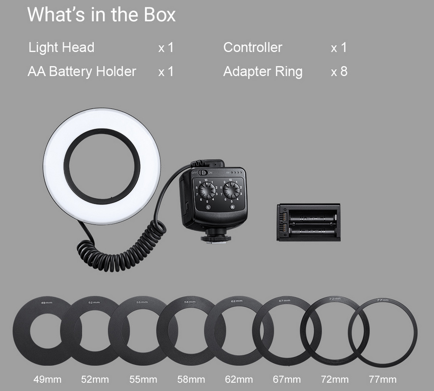 Godox Ring72 Macro LED Ring Light levereras komplett med anpassningsringar för filtergänga: Ø49, Ø52, Ø55, Ø58, Ø62, Ø67,Ø72 och Ø77mm.