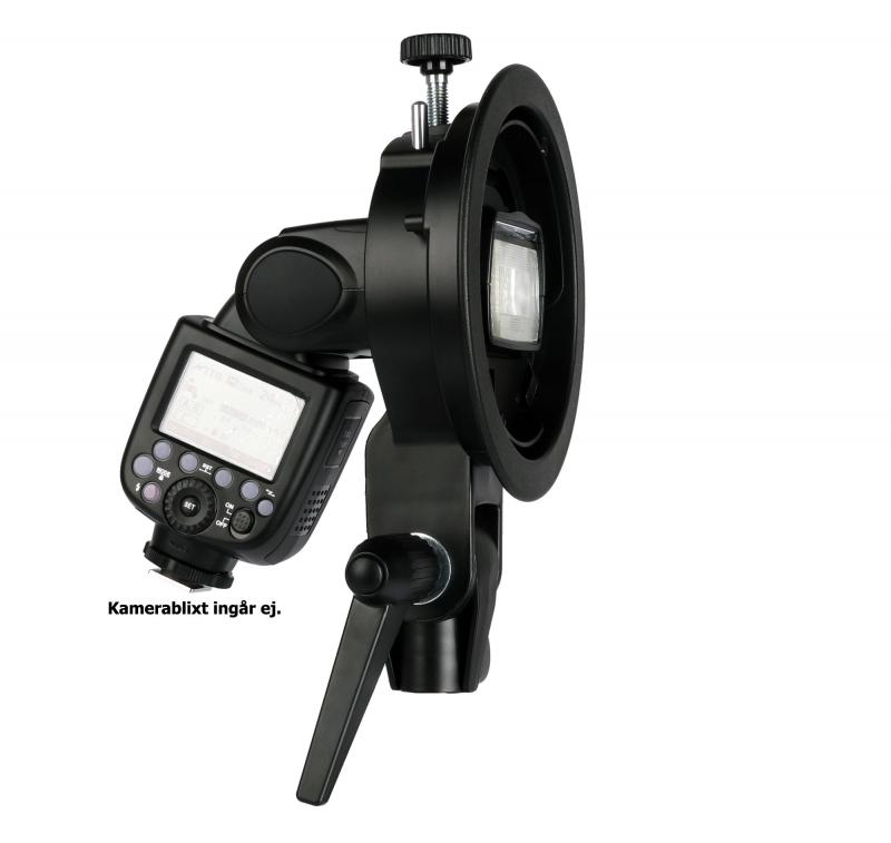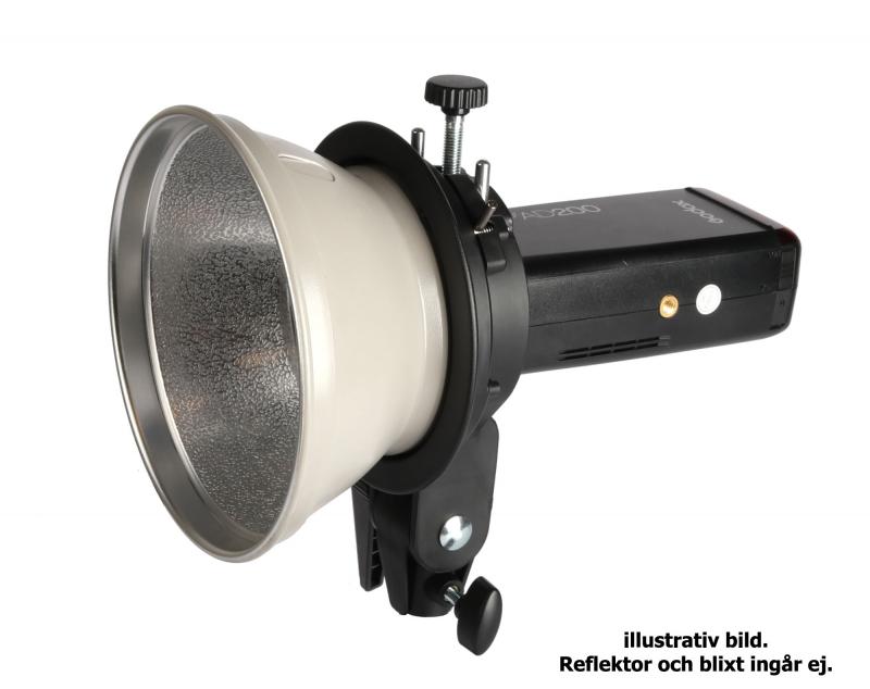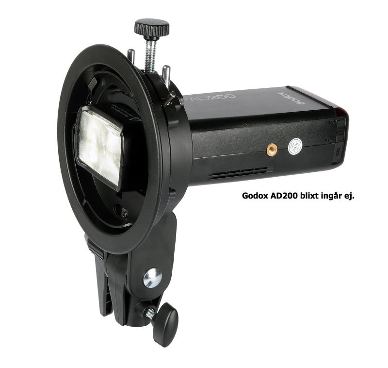 Godox S-EC Elinchrom-adapter används för att montera Elinchrom tillbehör (som t.ex softboxar, spotkoner och andra tillbehör med Elinchrom-bajonett) på en vanlig kamerablixt (eller på en Godox AD200 / AD200 Pro). Tack vare konstruktionen med "tvingfästet", så passar adaptern i stort sett till alla kamerablixtar på marknaden. Adaptern har även ett integrerat paraplyfäste, som gör det möjligt att använda paraply. En av fördelarna med att använda paraply är att man får en stor lysande yta. Klämbredd: cirka 8 cm. Max tjocklek: 5 cm.