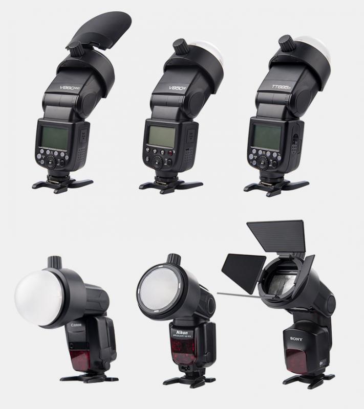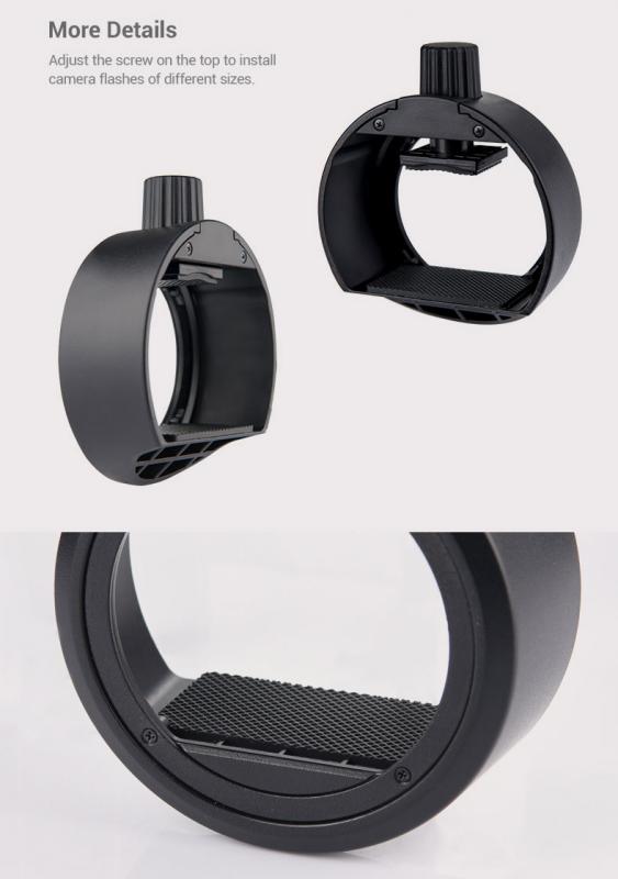 Godox S-R1 är en praktisk tillbehörsadapter, som gör det möjligt att montera en mängd olika ljusformare på din speedliteblixt! Den passar Godox Ving V860II, V860III, Yongnuo 560/565/YN600 (eller andra kamerablixtar i motsvarande storlek) och kan användas med Godox AK-R1 tillbehörspaket, som innehåller en mängd olika ljusformare. Tjockleken på blixthuvudet måste vara mellan 43-48mm för att kunna klämmas i fästet på Godox S-R1.