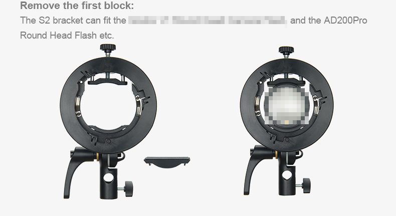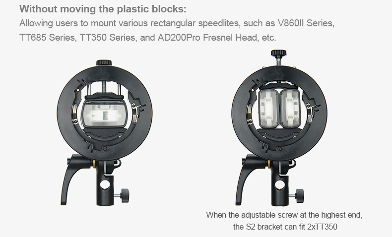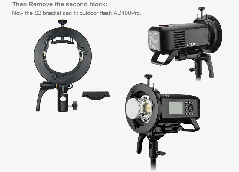 Godox S2 används främst för att montera Bowens-tillbehör (som t.ex softboxar, spotkoner och andra tillbehör med Bowens-bajonett) på en vanlig kamerablixt (eller på en Godox V1, AD100/AD200/ AD200 Pro/ AD200 Pro II/ AD300 Pro , AD400 Pro blixt eller en Godox ML60 belsyning). Tack vare att hållaren har två avtagbara distanser, så går öppningen på hållaren att anpassa till olika storlekar och typer av blixtar. Det går t.ex att montera allt ifrån små kamerablixtar (t.ex Godox TT350) till lite större studioblixtar, som t.ex Godox witstro AD400 Pro. Adaptern har även ett integrerat paraplyfäste, som gör det möjligt att använda paraply. En av fördelarna med att använda paraply (eller en softbox) är att man får en stor lysande yta. Godox S2 speedlite-hållaren har standard fäste för belysningsstativ och kan även användas handhållet i nederdelen av hållaren.