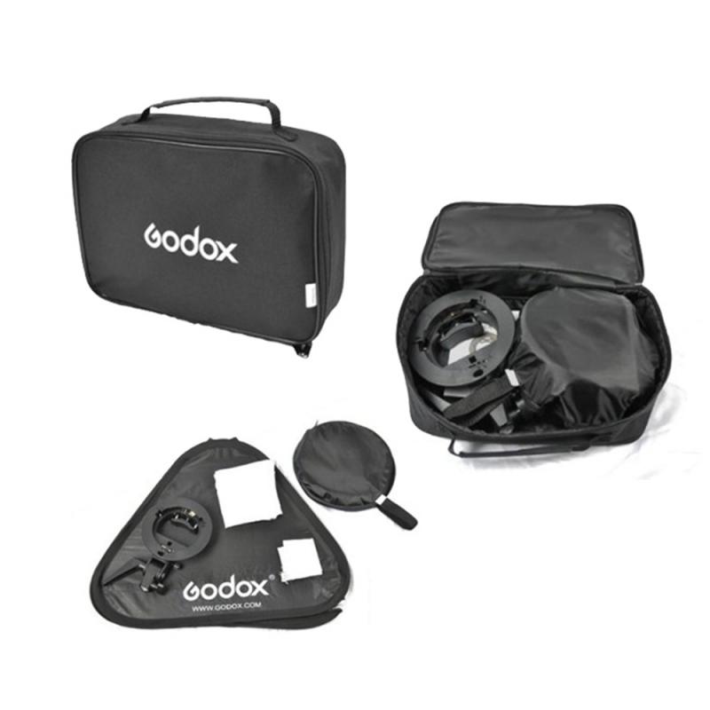 Godox Speedlite Popup Softbox 80x80 cm är en portabel softbox med ett kamerablixtfäste, som passar i stort sett till alla traditionella kamerablixtar med rektangulärt speedlite-huvud på marknaden. (Ej runda blixtar som t.ex V1/V100 mfl) Softboxen har den senaste "pop-up"-konstruktionen, vilket innebär att den fälls upp/ihop på ett par sekunder. Den viks ihop på samma sätt som en reflexskärm och tar minimalt med plats. Såväl softbox som blixtfästet ryms i den medföljande väskan Softboxen är försedd med dubbla diffusionsdukar, med kardborrefästen för enkel fastsättning på softboxen. Insidan av softboxen är klädd med högreflekterande "silverbeläggning", vilket koncentrerar ljuset mot diffusionsduken och minimerar ljusläckaget. Resultatet blir ett mjukt, jämnt ljus, från en stor lysande yta, perfekt vid ex. porträtt- eller produktfotografering. En extra funktion är att softboxen kan användas utan diffusionsdukar, som en stor reflektor.
