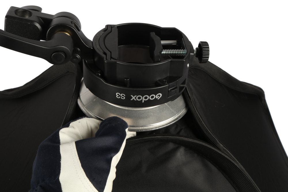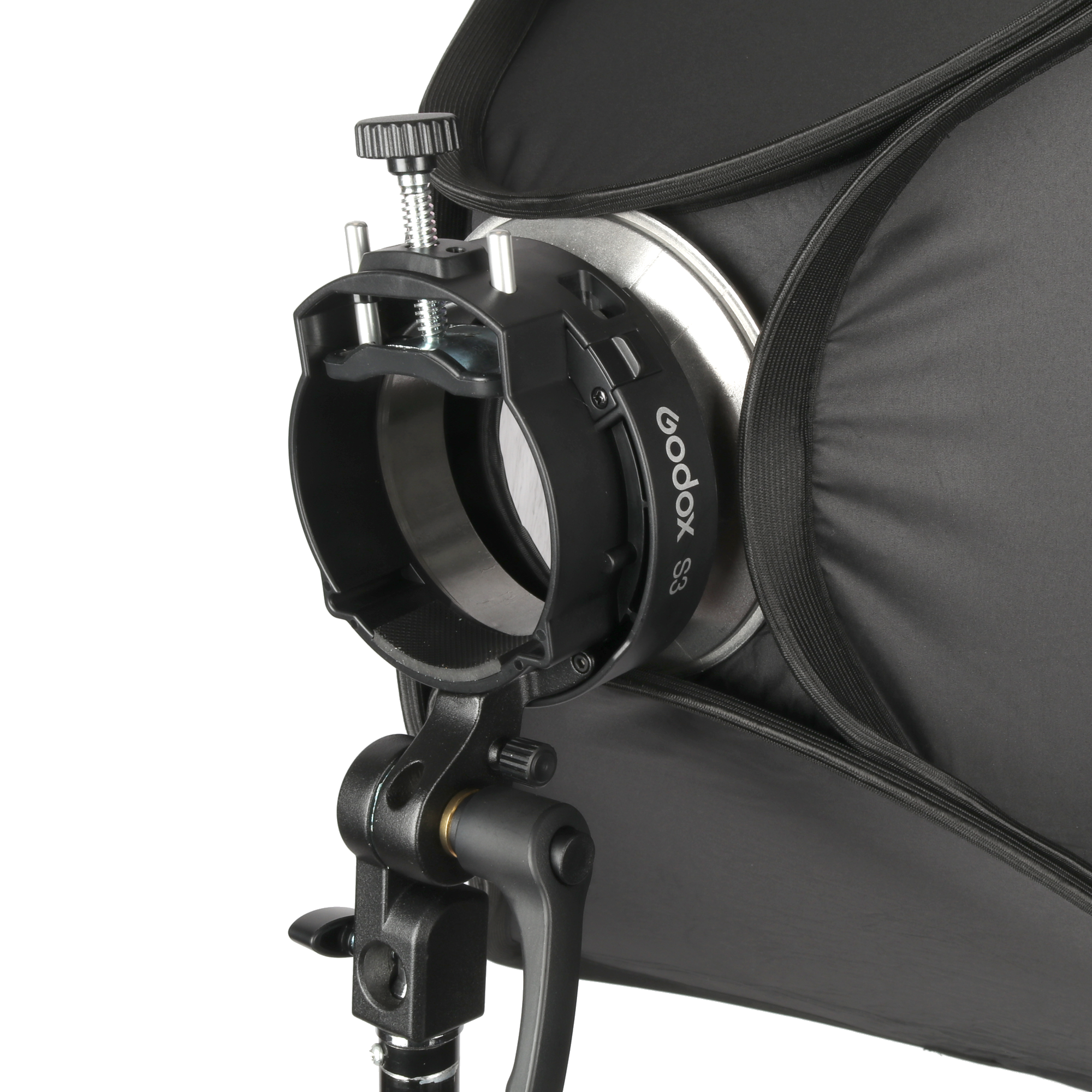 S3-hållaren har två avtagbara distanser som gör att öppningen kan justeras för olika storlekar och former på både kamera- och studioblixtar. Det går exempelvis att montera runda kamerablixtar som Godox V1, V1 MID, V1 Pro och V100, likväl som mindre blixtar som TT350 eller större enheter som Godox Witstro AD400 Pro. Adaptern har även ett integrerat paraplyfäste för användning med paraply, vilket ger en ännu större ljusyta och mjukare ljus.