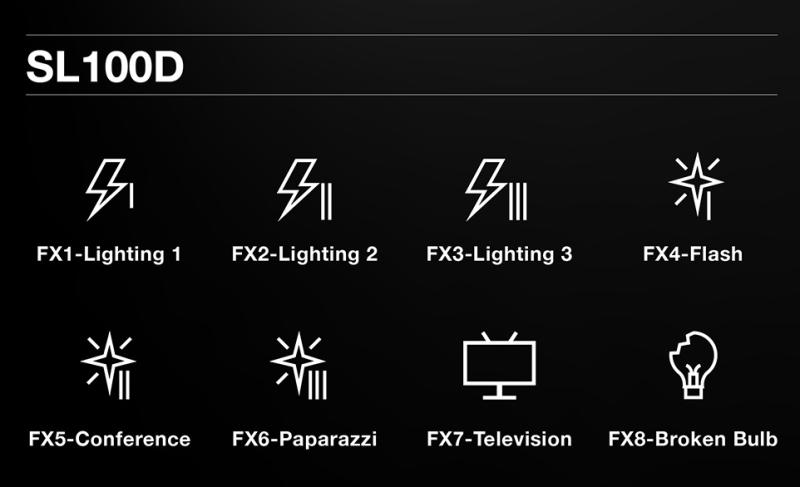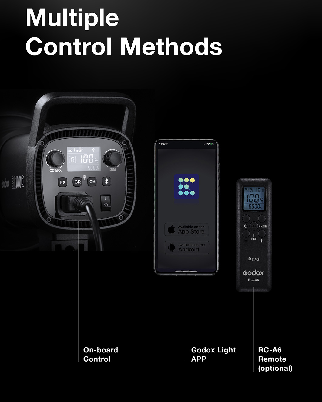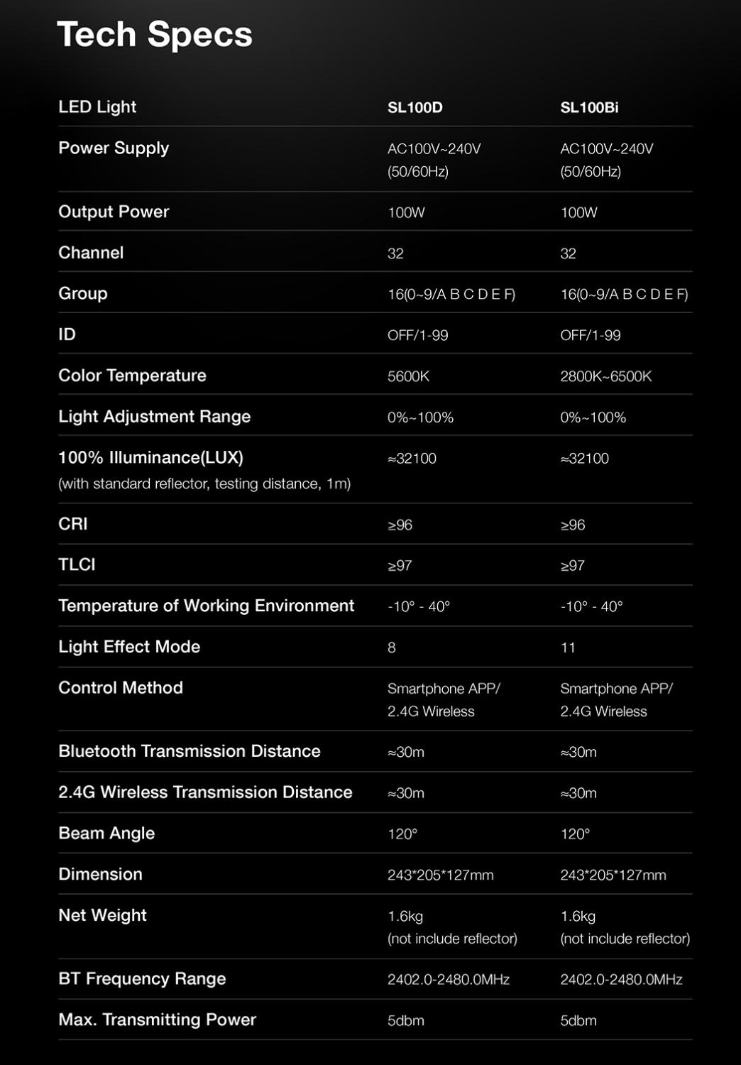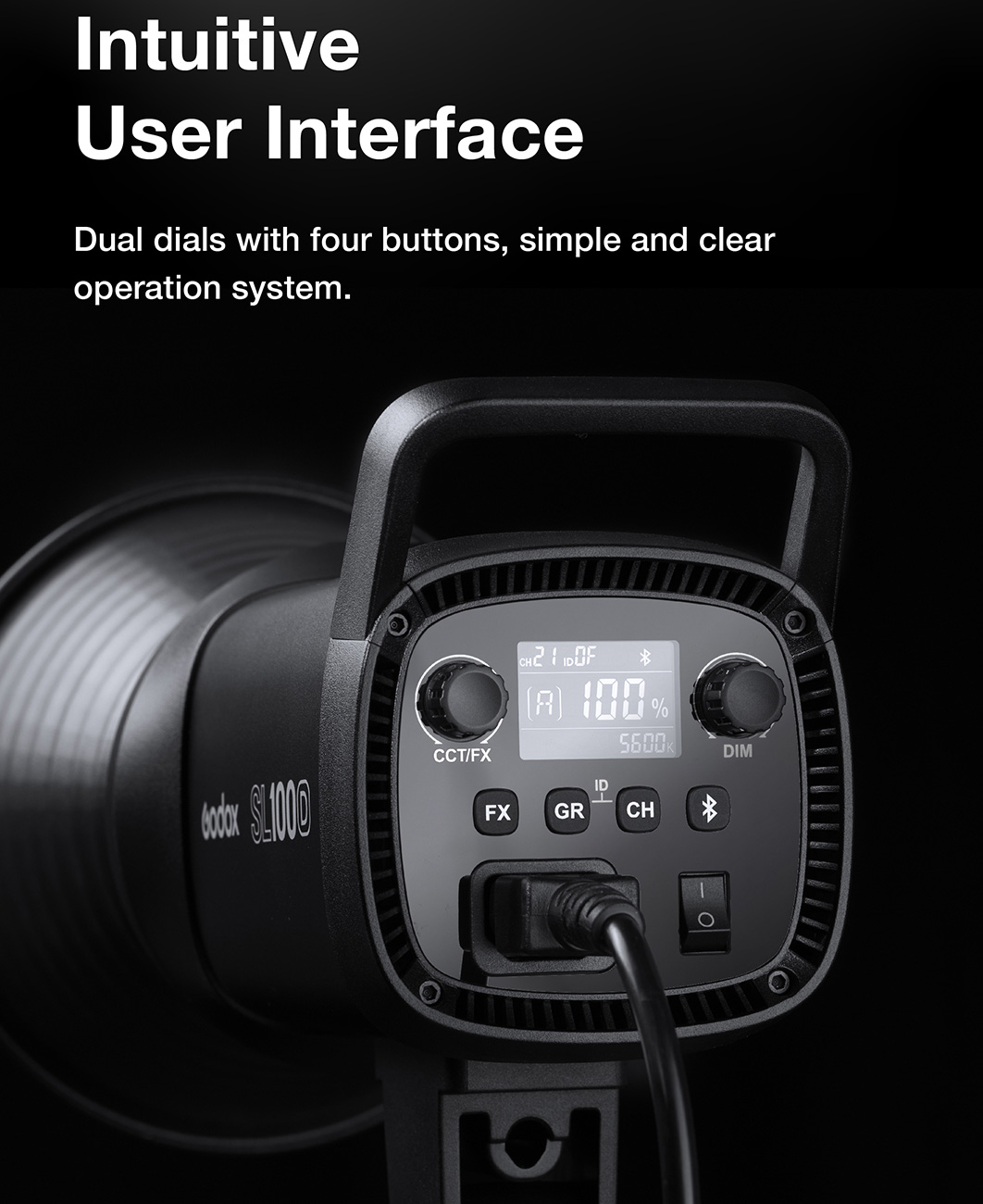 Godox SL100D är en mycket modern och kraftfull LED-belysning, som avger ett flimmerfritt dagsljus (5600°K) för fotografering och filmning. Belysningen avger ett rent dagsljus (32.100 Lux/1m), med ett högt CRI -värde(≥96) och (Television Light Consistency Index, TLCI ≥ 97) för bättre färgåtergivning vid filmning. Belysningen ersätter den tidigare storsäljaren Godox SL60W. Godox SL100D kan styras via reglagen på baksidan av armaturen, via fjärrkontroll RC-A6 (Säljs separat) eller via bluetooth (Smartphone App finns för iOS och Android). Belysningen har ställbar ljusstyrka (0-100%), stöd för åtta olika FX-effekter och Bowens-fattning, som gör det möjligt att montera olika ljusformare för att få full kontroll av ljusspridningen.