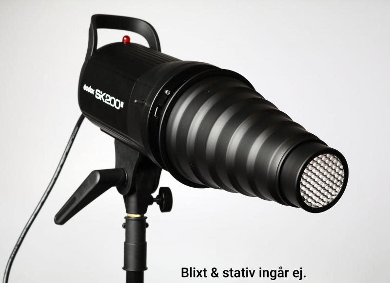 Godox SN01 Snoot är en spotkon, som är perfekt för t.ex "hårljus" eller punktljus. Bikakerastret kan plockas bort om större "ljusspot" önskas.
