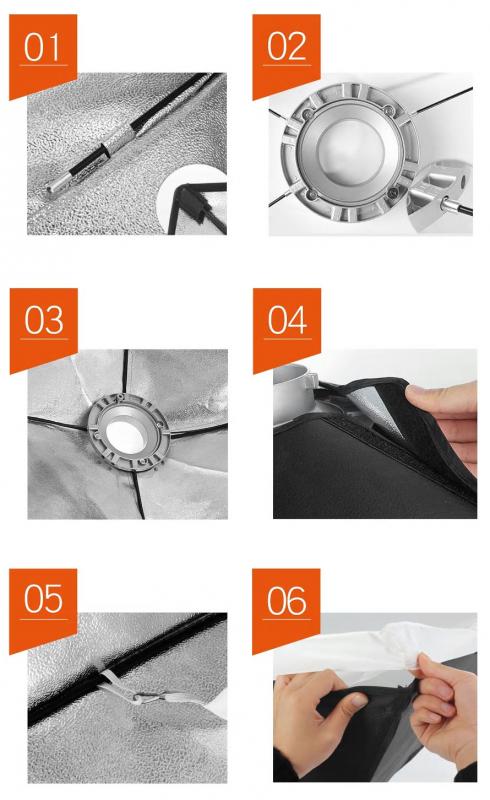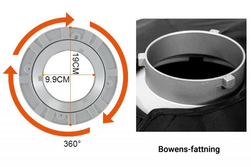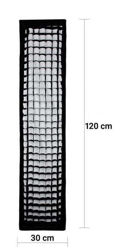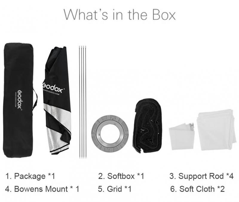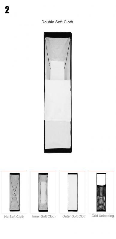 Godox 30x120 softbox är försedd med kardborrefästen för enkel fastsättning av diffusionsduk och raster. Insidan av softboxen är klädd med högreflekterande "silverbeläggning", vilket koncentrerar ljuset mot diffusionsduken och minimerar ljusläckaget. Softboxen är även försedd med en inre diffusionsduk. Resultatet blir ett mjukt och jämnt ljus. Softboxen har en speedring, med Bowens-fattning och passar således en mängd blixtar och belysningar från t.ex Visico, Aputure, Godox mfl. Softboxen kan roteras och användas t.ex horisontellt för att belysa ett fotobord.