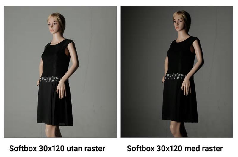 Softboxen har ett avtagbart raster, som kan användas för att få ett mera riktat ljus.