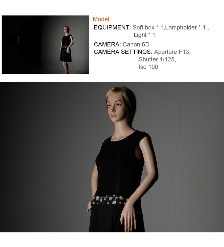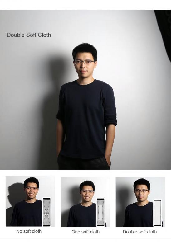 Bilderna ovan visar skillnaden om man använder softboxen utan diffusionsdukar (hårt ljus), softboxen med inre diffussionsduk och softboxen med dubbla diffusionsdukar.