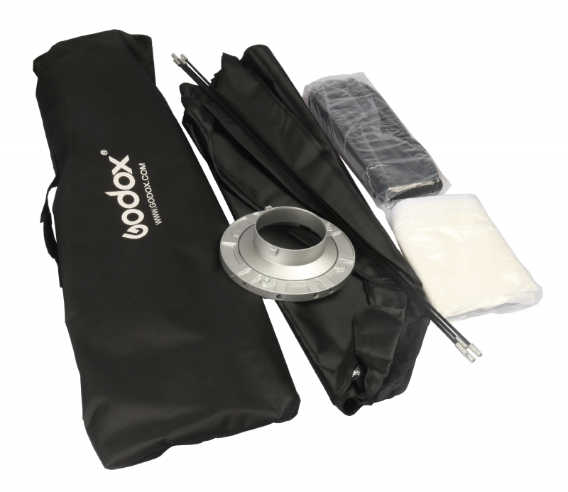 Softboxen är försedd med kardborrefästen för enkel fastsättning av diffsuionsduk och raster. Insidan av softboxen är klädd med högreflekterande "silverbeläggning", vilket koncentrerar ljuset mot diffusionsduken och minimerar ljusläckaget. Softtboxen är även försedd med en inre diffusionsduk. Resultatet blir ett mjukt, jämnt ljus, från en stor lysande yta, perfekt vid t. ex. produktfotografering. En extra funktion är att softboxen kan användas utan diffusionsdukar, som en stor reflektor. Godox softbox har Bowens/ Visico-bajonett (Samma bajonett som till Godox AD600 Pro,AD600B, 600BM, QT400IIM, QS400,MS200, SK200 (Bowens), Aputure, FotoBestway, Nicefoto mfl.) och passar således till en mängd olika fabrikat av belysningar och studioblixtar på marknaden. Bra konstruktion och hög kvalité på material.
