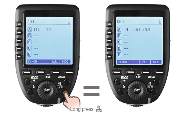 En nyhet på GODOX X-PRO är den nya TCM-funktionen, som innebär att man kan mäta blixtljuset i TTL-läget och sedan låta sändaren konvertera TTL-datan till ett manuellt-effektvärde för att få korrekt exponering i manuellt-läge. Ställ kameran och Godox X-PRO sändaren på Auto/TTL och låt kameran bestämma exponeringen. Tryck sedan ner TCM-knappen på sändaren, så växlas skärmen från TTL till manuellt-läge samtidigt som X-PRO sändaren på ett ögonblick omvandlar TTL-datan till manuella värden. En förutsättning för TCM-funktionen är naturligtvis att man använder kompatibla TTL-blixtar från Godox.