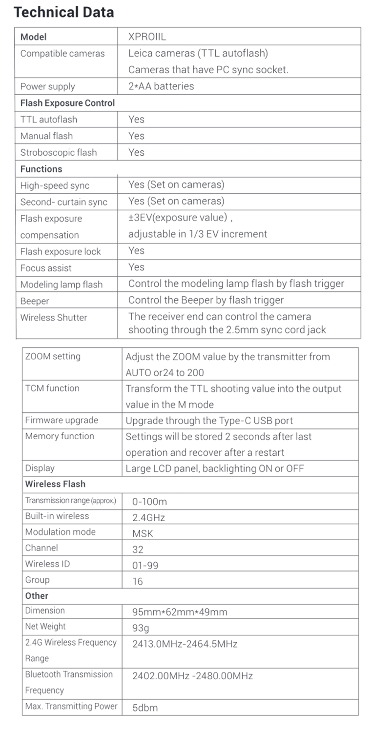 Godox XPROII L TTL Wireless Flash Trigger är andra generationen (II) av XPRO sändare för Leica kameror och stödjer t.ex TTL-automatik, Bluetooth och High Speed Sync (snabba slutartider upp till 1/8000s). Radiosändaren monteras i kamerans blixtsko och används för att trigga och styra blixtar (Wireless X) från Godox. Det går smidigt att direkt på sändaren ändra alla möjliga inställningar, som t.ex effekt i manuellt läge och blixtkompensation (FEC) i TTL-läget för olika blixtar och blixtgrupper. Tack vare att sändaren har bluetooth, så kan man även använda sin smartphone för att styra blixtarna via bluetooth till sändaren.