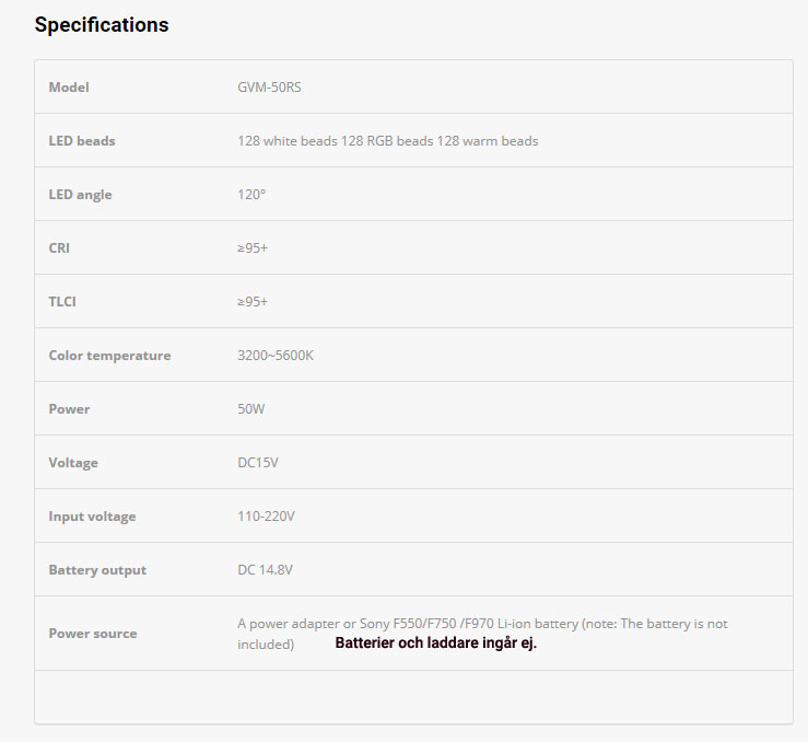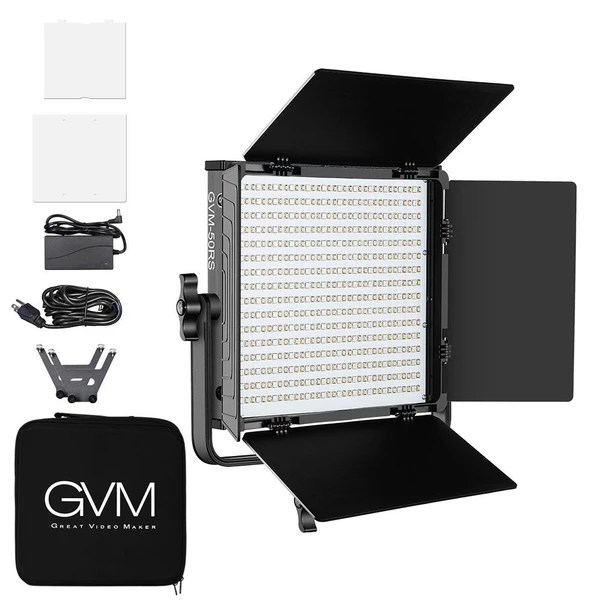 GVM® 50RS RGB är även utrustad med skärmklaffar (Barndoors), som kan användas för att styra ljusspridningen. Till skillnad från att sprida ljuset åt alla håll så kan man med skärmklaffarna på LED-belysningen undvika att ljuset träffar en del av motivet eller bakgrunden. Skärmklaffarna fungerar även som skydd för belysningen under transport och förvaring. GVM 50RS-RGB kan strömförsörjas antingen via elnätet (230V nätadapter) eller via två stycken laddningsbara batterier ( av typ NP-970), som monteras på baksidan av LED-panelen. (Batterier och laddare ingår ej.)