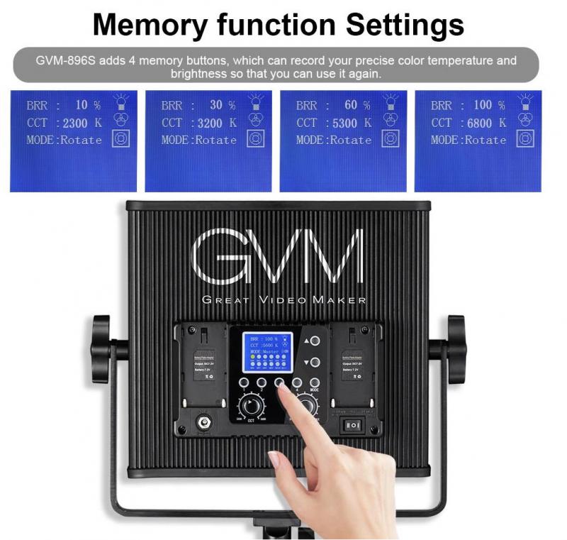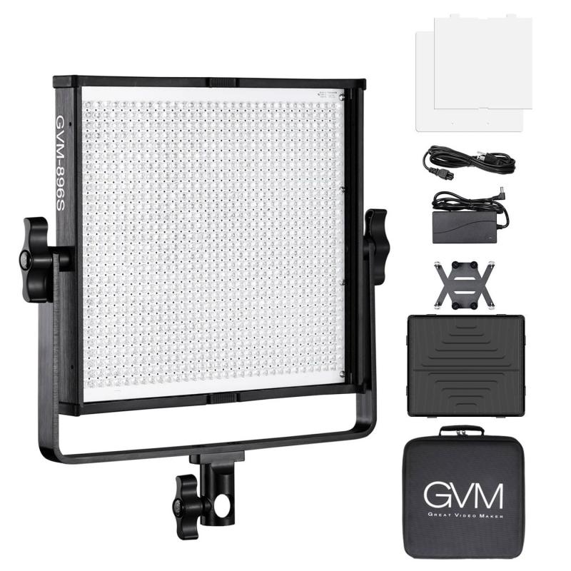 LED-panelen är utrustad med en färgskärm och har genomtänkt design, största delen av baksidan är till exempel tillverkad av aluminium och fungerar som passiv kylning åt elektroniken. Tack vare att LED-panelen har en stor lysande yta (255x230mm), med 896 lysdioder och avtagbart diffusionsfilter, så får man ett mjukt och fint ljus. Det följer även med en större diffusor-skiva (320x300mm), som kan monteras med metallfästen framför LED-panelen. GVM 896S har även en Wireless Master-Slave-funktion, som gör det möjligt att från en LED-panel styra inställningar på andra LED-paneler i 896-serien. Fjärrkontroll ingår ej.