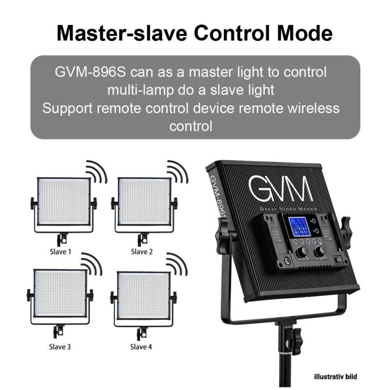 GVM 896S har även en Wireless Master-Slave-funktion, som gör det möjligt att från en LED-panel styra inställningar på andra LED-paneler i 896-serien. Ställ in en av belysningarna som Master och dina andra 896S-belysningar som Slave, så kan du från Master-enheten ändra effekt och färgtemperatur på din andra Slave-enheter. Systemet har stöd för 12 grupper.