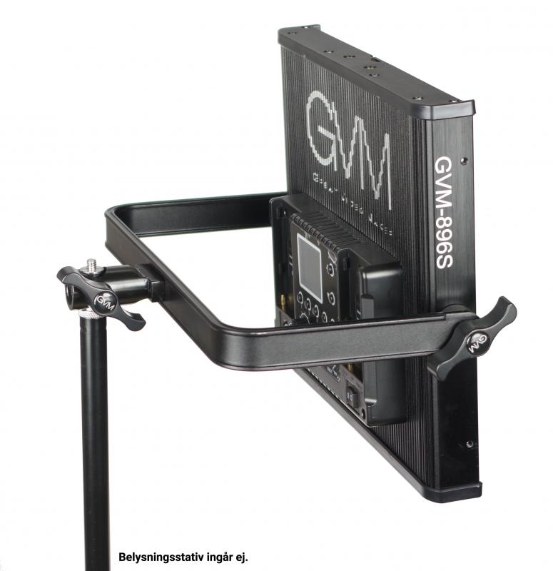 GVM LED-panel är monterad i en U-ram, med rejäla låsrattar, och standard studiofäste (5/8") för belysningsstativ och bommar. Fästet för U-ramen kan även monteras horisontellt på ett belysningsstativ, vilket ger andra möjligheter att vinkla belysningen. Belysningen och tillbehören levereras i en vadderad GVM Transportväska.