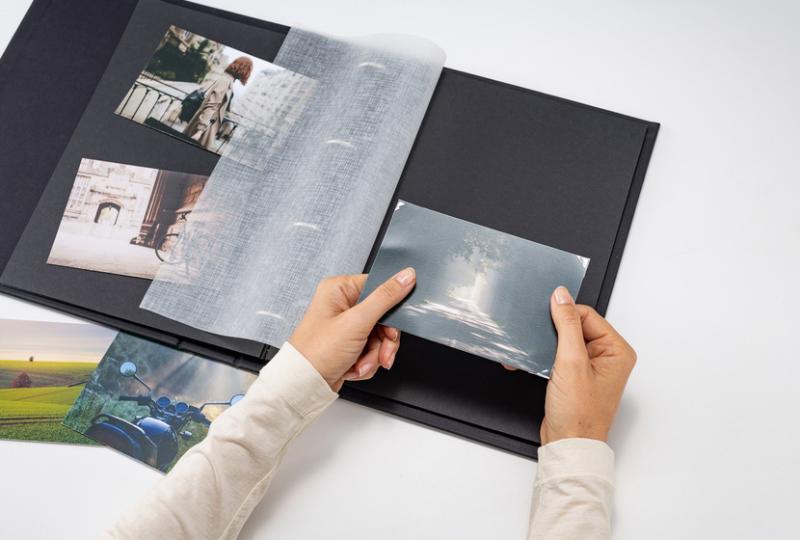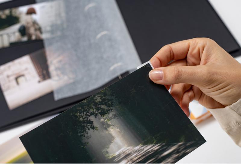 Transparenta fotohörn för montering av fotografier, Polaroid eller Instax . Hörnen är lösningsmedels- och syrafritt och arkiveringsbeständigt.