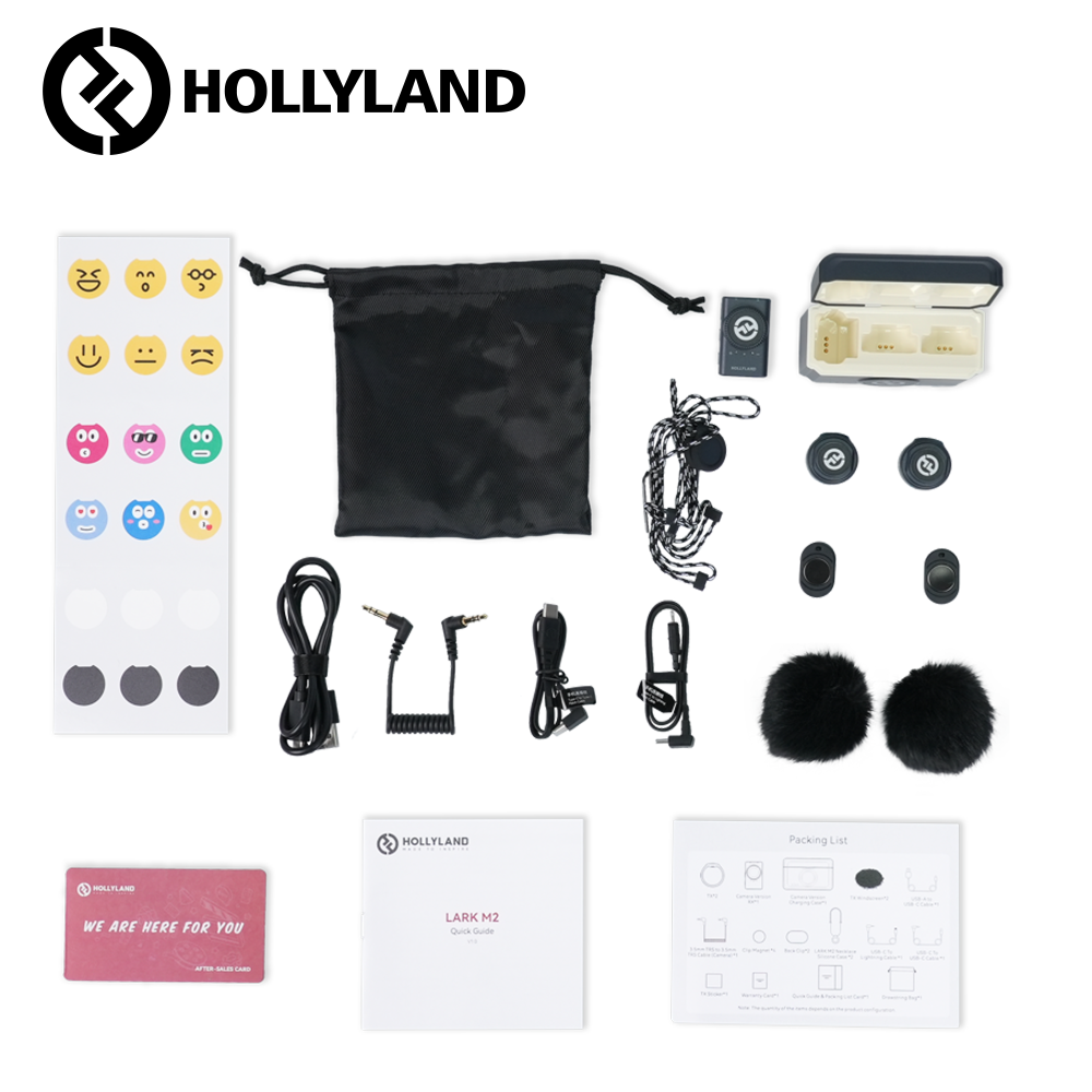 LARK M2 levereras med ett paket användbara tillbehör, inklusive vindskydd för inspelning utomhus, kabelanslutningar för enkel anslutning och ett speciellt utformat halsband för varje TX. Med dessa tillbehör har du allt du behöver för att ställa in din LARK M2 och njuta av dess funktioner.