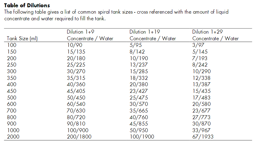 Spädnings-lathund: Exempel: Om du ska blanda ut 300ml filmframkallare (spädning 1+9), så ska du ha 30ml koncentrerat framkallare och 270ml vatten.
