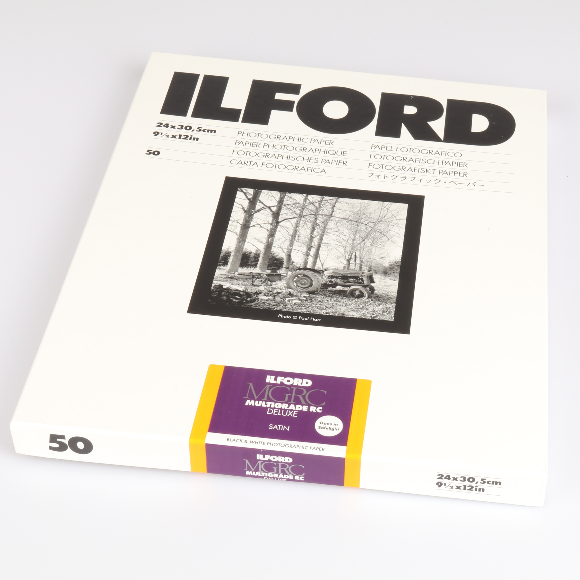 Ilford Multigrade RC Deluxe är ett modernt svart/vitt fotopapper (Version V), med variabel kontrast och neutral bildton. RC-bas. Satin-yta.