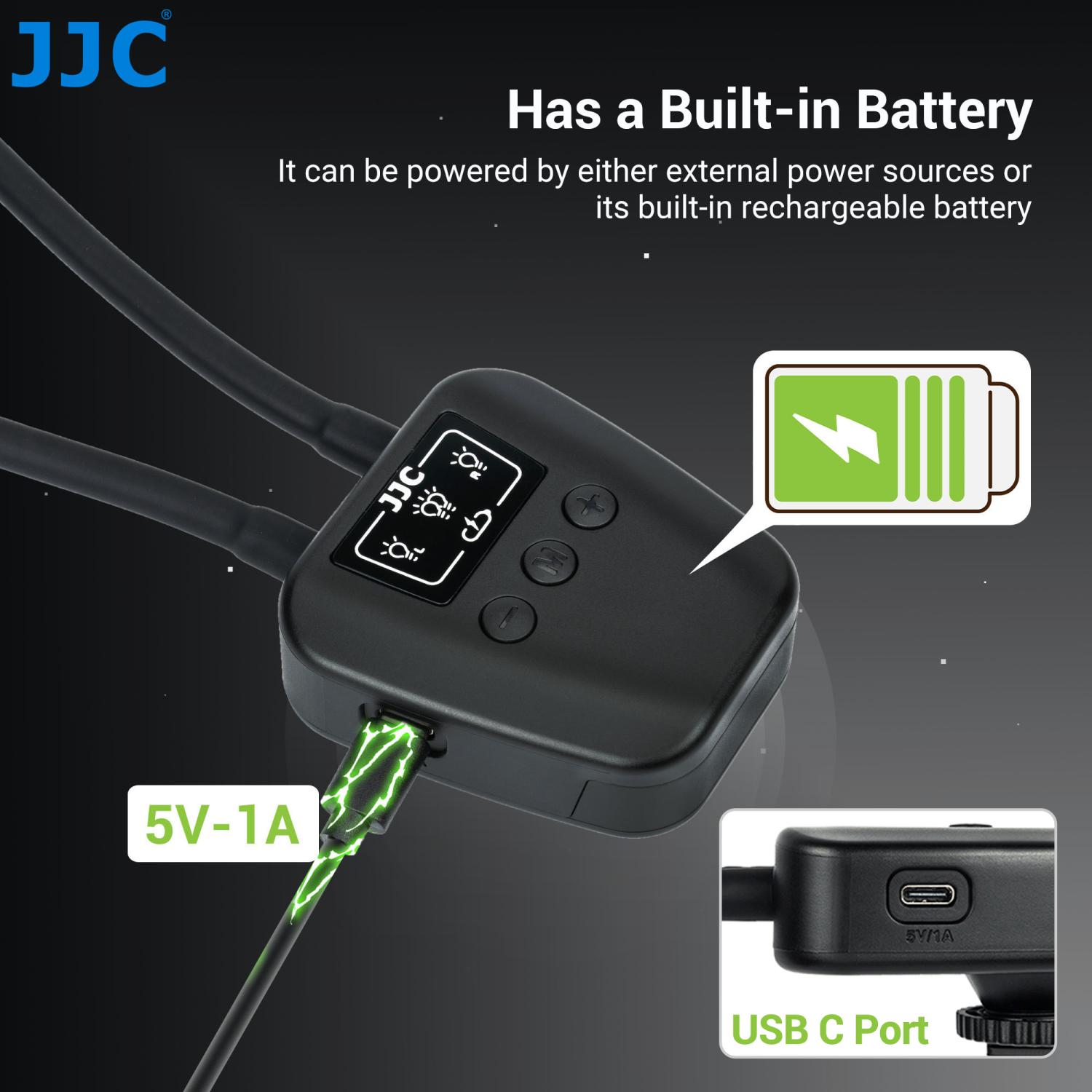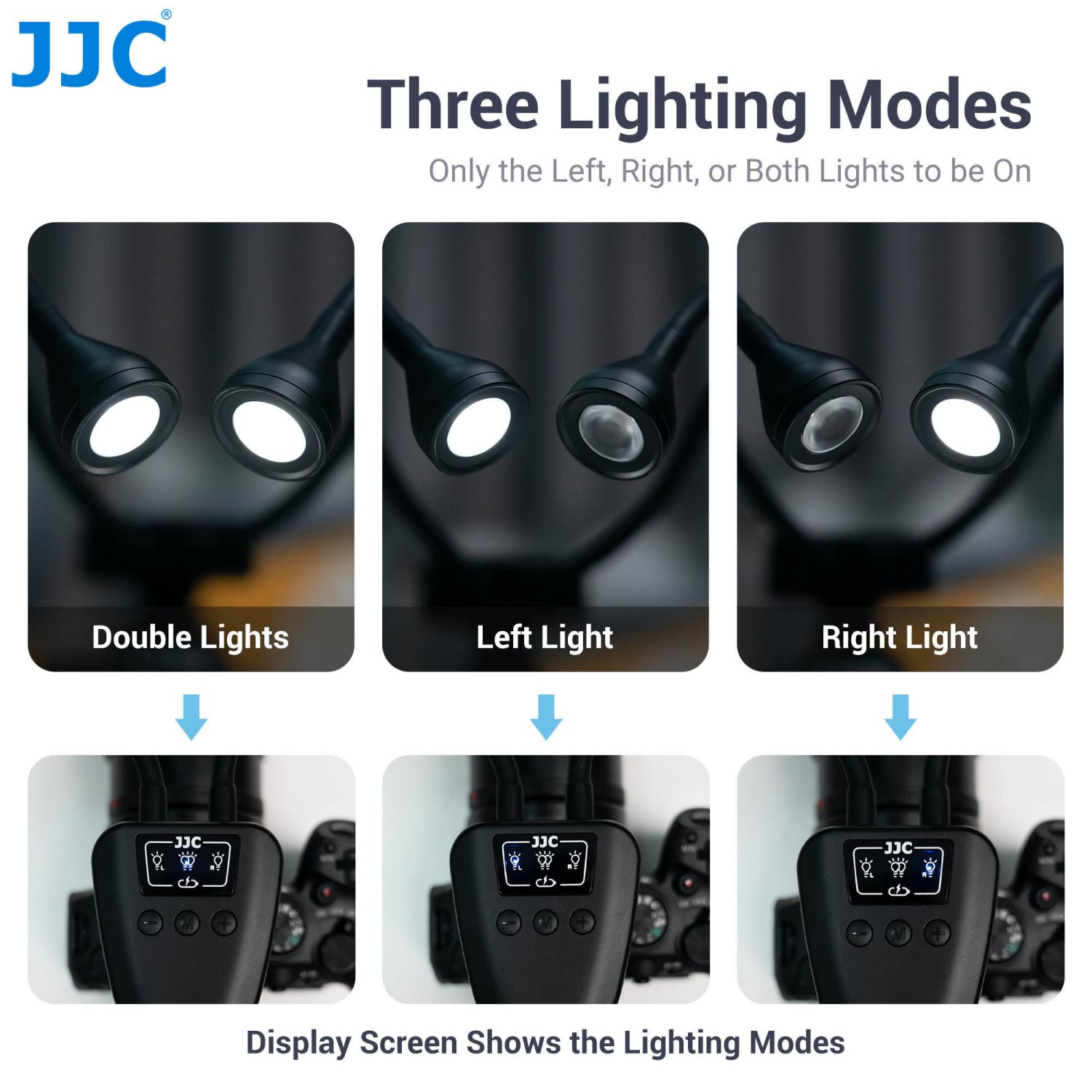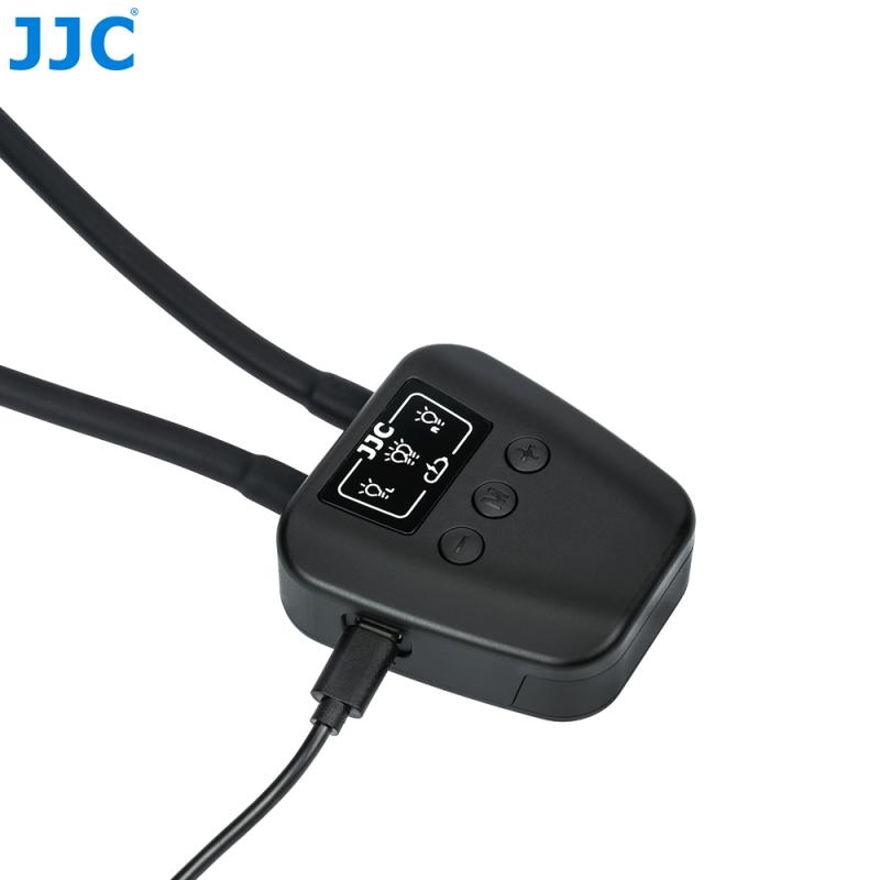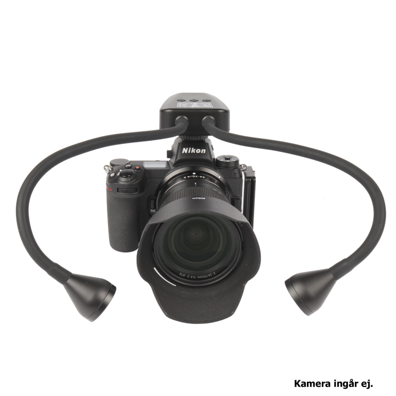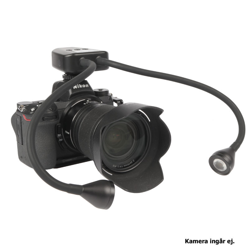 JJC LED-ARM2 Macro LED är en professionell macrobelysning, med dubbla LED-lampor på gummerade flexiarmar, som gör det möjligt att belysa motivet från olika vinklar. Perfekt att använda vid fotografering av närbilder på t.ex småkryp, smycken, blommor och växter. Ljuset är dagsljus (5600°K) med ett högt CRI-värde på 95+. Ljusstyrkan (vid full effekt) är 24.000 Lux på 8cm. Tack vare att belysningen sitter monterad på flexiarmar, så undviker man risken att objektivet skuggar hela eller delar av motivet vid macrofotografering. En annan smart funktion med belysningen är att det går att ställa in olika effekt (ljusstyrka) på vänster- och höger LED-lampa för att t.ex framhäva motivets former. Ljusstyrkan är individuellt ställbar i 10 olika lägen. LED-lamporna strömförsörjs via ett uppladdningsbart batteri (600mAh) som är integrerat i macrobelysningen. Inställning av lamporna sker smidigt via knappar (+, Mode,-) på ovansidan.