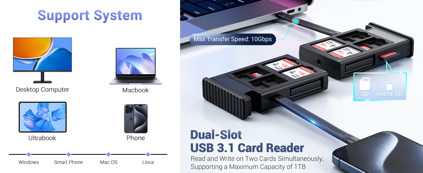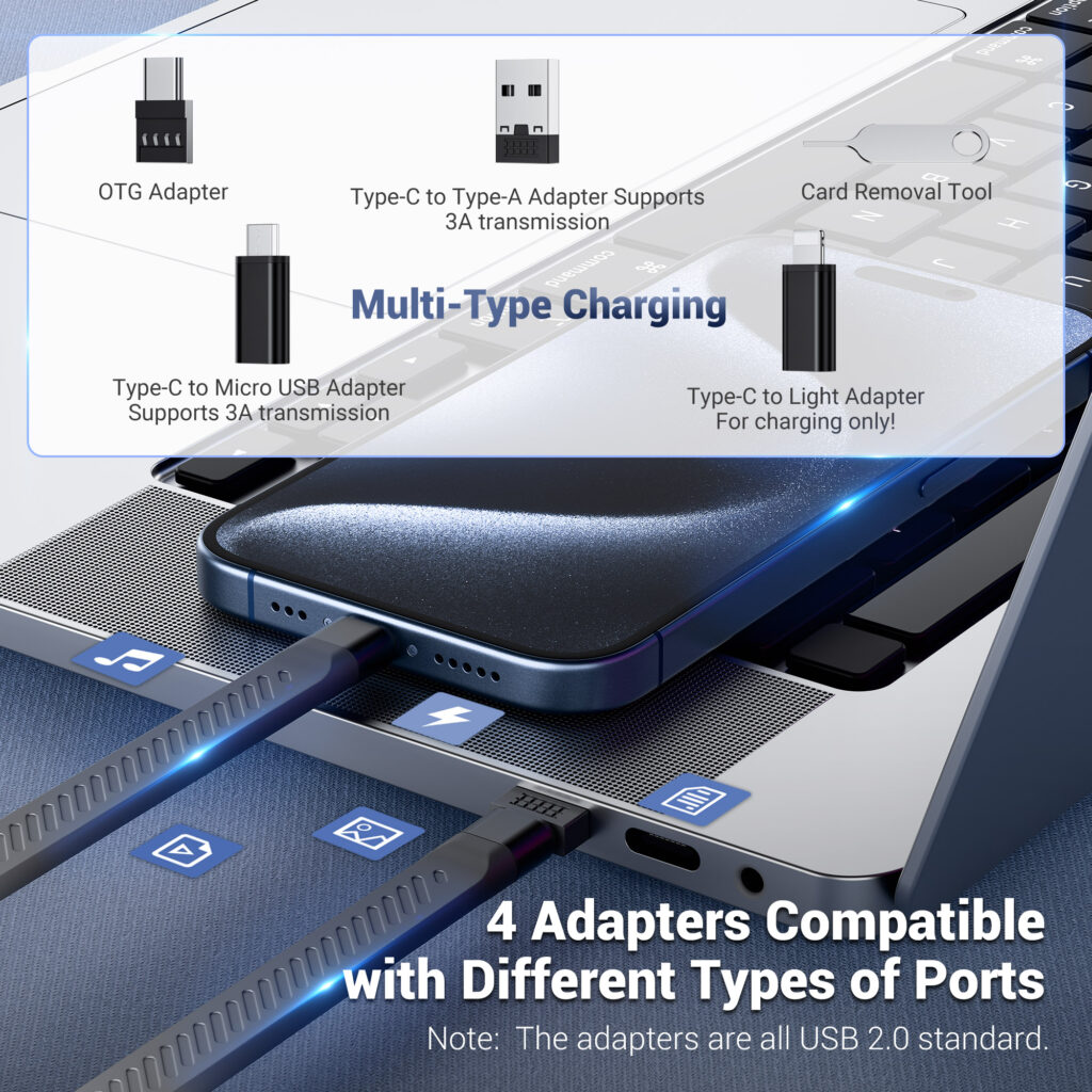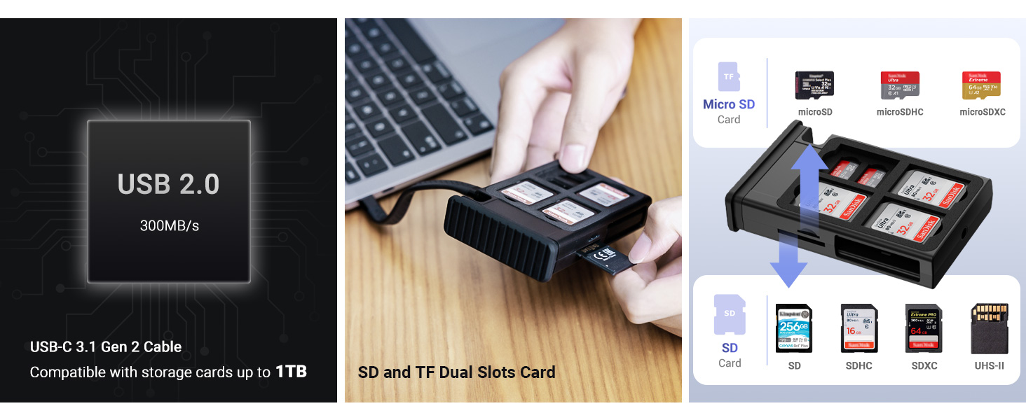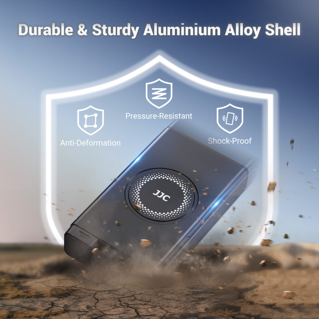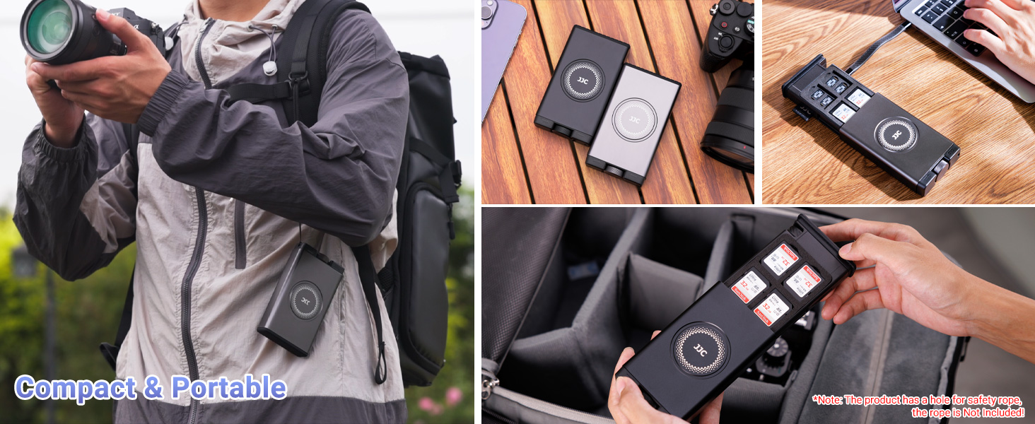JJC MFCC-1 Multifunctional Card Station Reader and Storage är en kompakt allt-i-ett digital lösning för urbana fotografer på språng. JJC MFCC-1 har plats för 8 SD kort eller 16 Micro SD-kort, integrerad Dual kortläsare (300MB/S) och levereras med mängd olika olika adaptrar från USB-C till Micro USB, USB-A och Lightning och en OTG-adapter för Multi-type charging (laddning). Robust konstruktion, med stöttåligt hölje av aluminium (Premium-känsla) med EVA-fack för minneskorten. Det följer med en USB-C kabel ( 3.1 Gen 2). Den här produkten fungerar också som en höghastighets kortläsare, som är kompatibel med UHS-II kort. Den stöder överföringshastigheter upp till 300 MB/s* med den medföljande USB-C 3.1 Gen 2-kabeln. Den dubbla kortplatsdesignen möjliggör samtidig läsning och skrivning av ett SD-kort och ett microSD-kort, som är kompatibla med lagringskort upp till 1 TB.