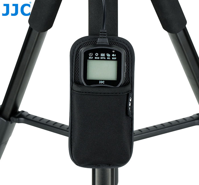 Ett praktiskt fodral för JJC TM LCD timers, som gör det möjligt att förvara fjärrkontrollen i fodralet (på stativbenet) när den inte används.