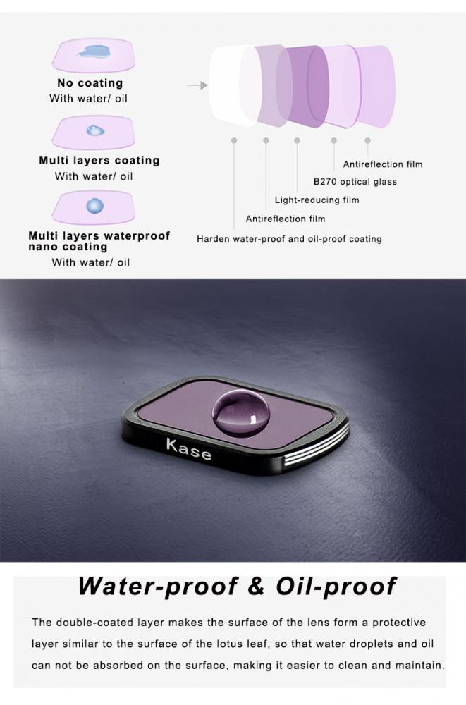 Filtret är tillverkat av optiskt B270-glas från tyska Schott® och härdat och Nano-behandlat av Kase® filter för att uppfylla extrema krav.Tack vare avancerad och dubbelsidig MultiCoating (Nano-coating), i kombination med B270-glas så får filtret enastående optiska egenskaper. Ytan på filtret är både vattenavstötande och oljebeständigt. Filtret blockerar även IR-strålning, vilket ger skarpare bilder. Filterramarna är tillverkade i en 6063 aluminiumlegering, med magnetfäste för enkel fastsättning på DJI Osmo. Kase® Magnetic ND4 är försedd med magnetfäste, som gör det enkelt och snabbt att fästa filtret på Dji Osmo Pocket.