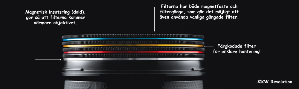 Kase® KW Revolution Magnetic Pro kit (Ø95mm) är ett professionellt filterpaket i nya revolution-serien, med ett noga urval av runda magnetiska kamerafilter (av B270 Wolverine-glas), som ger dig rätt förutsättningar att plåta landskap med t.ex långa slutartider. Filterna i Revolution-serien är en vidareutveckling av Wolverine Magnetic-filterna och försedda med färgkoder (för snabbare hantering) och ett kombinerat magnetfäste med filtergänga, som gör det möjligt att även använda vanliga kamerafilter (med filtergänga) på Revolution filterna. En annan nyhet i Revolution-serien är att det följer med en magnetisk insatsring, som kan skruvas in i objektivets filtergänga, vilket minskar risken för vinjettering.