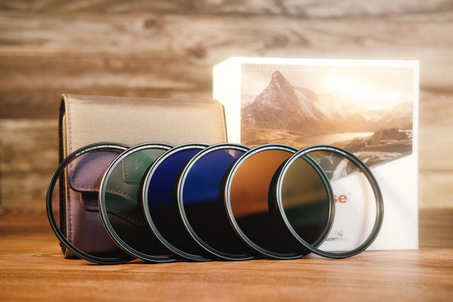 Kase® KW Revolution Magnetic MEGA kit (Ø82mm) är det mest kompletta filterpaketet i nya KW Revolution-serien från Kase filter. Mega paketet innehåller ett brett urval av filter, inklusive ND-filter i olika styrkor, polarisationsfilter, UV-filter och Neutral Night-filter. Filterna levereras i en filterväska tillsammans med en magnetisk adapterring och magnetisk inlaid-ring för objektiv med 82mm filtergänga. Filterna i Revolution-serien är en vidareutveckling av Wolverine Magnetic-filterna och försedda med färgkoder (för snabbare hantering) och ett kombinerat magnetfäste med filtergänga, som gör det möjligt att även använda vanliga kamerafilter (med filtergänga) på Revolution filterna. En annan nyhet i Revolution-serien är att det följer med en magnetisk insatsring, som kan skruvas in i objektivets filtergänga, vilket minskar risken för vinjettering.