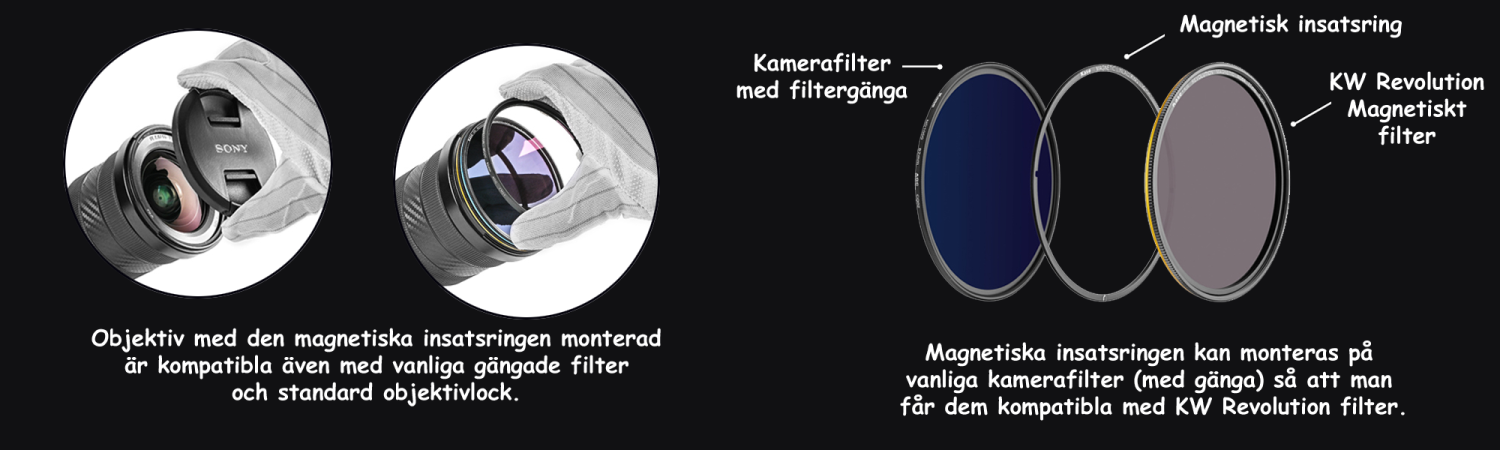 Kase Revolution magnetisk insatsring (Magnetic inlaid ring) kan användas istället för adapteringen och skruvas in i objektivet filtergänga (112mm). En fördel med den magnetiska insatsringen är att den inte bygger något (dvs mindre risk för vinjettering) , då filtret/ filterna kommer betydligt närmare objektivet. Insatsringen kan också skruvas in i gängan på ett vanligt kamerafilter (Ø112mm) om man vill få ett magnetfäste. Levereras komplett med plastverktyg för montering. (Magnetic Inlaid-ringen fungerar endast för Revolution-filter. Ej för Wolverine-serien.)