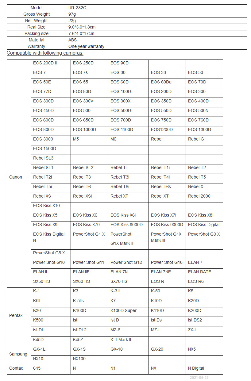 1C kontakten passar bland annat Canon EOS R, RP, R3, R5, R6, R7, R10, 60D/ 33/ 30/ 300 / 300D / 350D / 400D / 450D/500D/550D /600D/ 60D/ 1000D/1100D, Canon Powershot G1X,G10, G11, G12.