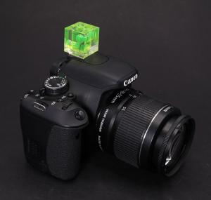 Trippel-Libell för montering i kamerans blixtsko. Trippel-Libellen passar alla kameror med standard blixtsko (och även kameror som har blixtskon på sidan av kamerahuset.) Trippel-Libellen består av 3 libeller ingjutna i en kub, så att man alltid kan positionera sig i X- och Y-led oavsett hur kuben är vänd.