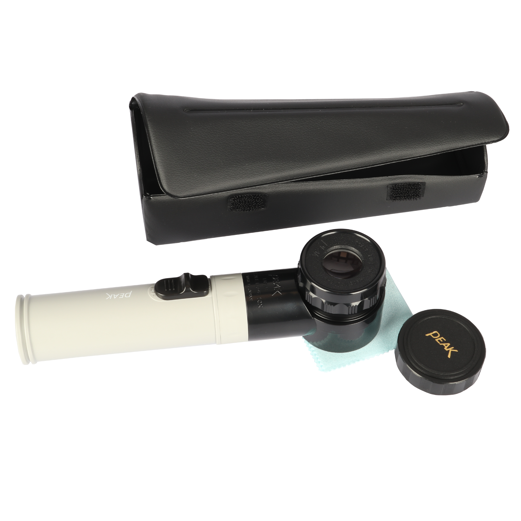 Professionell, färgkorrigerad japansk Peak lupp (P1983) med 10x förstoring och en inbyggd mätskala, utrustad med belysning i ett avtagbart handtag.
