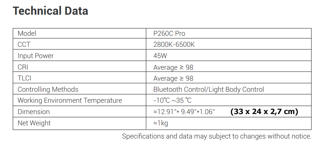 Godox P260C Pro har ställbar effekt (0-100%) och ställbar färgtemperatur (2800°K-6500°K). Belysningarna avger ett flimmerfritt ljus, med ett högt CRI -värde (98+) och (Television Light Consistency Index, TLCI ≥ 98+) för bättre färgåtergivning vid filmning. Godox P260C Pro kan strömförsörjas antingen via medföljande nätadapter (230V) eller via två stycken laddningsbara batterier ( av typ NP-970), som monteras på baksidan av LED-panelen. (Batterier och batteriladdare ingår ej.) Det finns även ett USB-C uttag, som gör det möjligt att driva panelen från t.ex en kraftfull powerbank/ USB-adapter. (Notera att Ledpanelen har en effekt på 45W, så strömförsörjningen bör vara på minst 50W. Powerbank/USB adapter ingår ej.) Godox P260C Pro har stöd för elva olika FX-effekter, som tex Broken Bulb, Fire mm.
