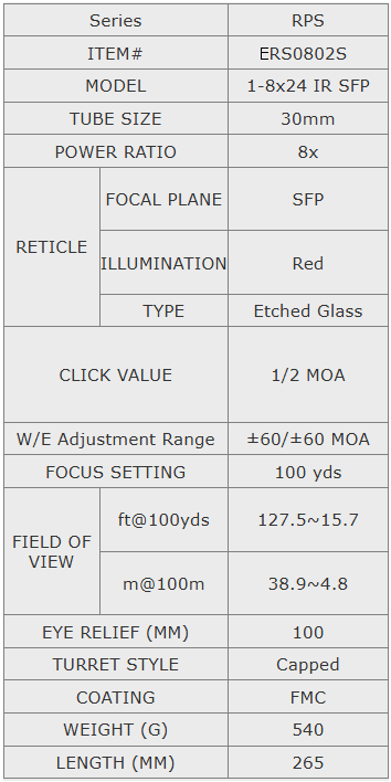 Nutrek Reaper 1-8x24 SFP IR LPVO är ett högkvalitativt kikarsikte, med ett mycket snabbt, tydligt och exakt riktmedel. Siktet ger en knivskarp, klar och tydlig bild över hela synfältet, nästan 40m. på 100m avstånd vid 1x och nästan 5m. vid 8x! Tack vare riktmedlet kan LPVO-siktet användas som "Rödpunktssikte" vid låga förstoringar (In med målet i ringen-Finrikta med punkten-Pang). Tack vare att förstoringen går upp till 8x så är det enkelt att ta skott även på långa avstånd.
