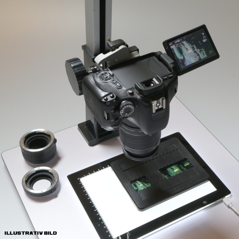 TIPS! För att komma tillräckligt nära filmen så behöver man ofta använda en mellanringssats mellan kameran och objektivet. Eller close-up-linser på objektivet. Om du är osäker så kan du rita en fyrkant (med samma storlek som en filmruta, storlek 24x36mm) på ett papper. Sen kan du testa med din kamera och ditt objektiv, på vilket avstånd rutan fyller upp hela kamerans sensor och om den blir skarp.