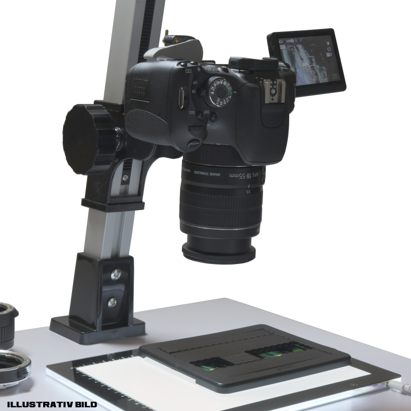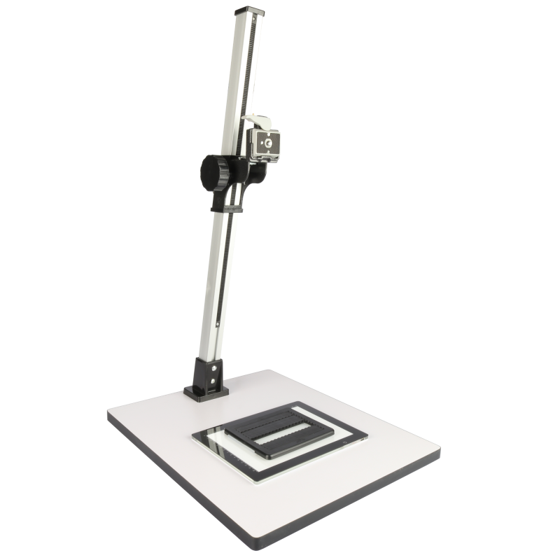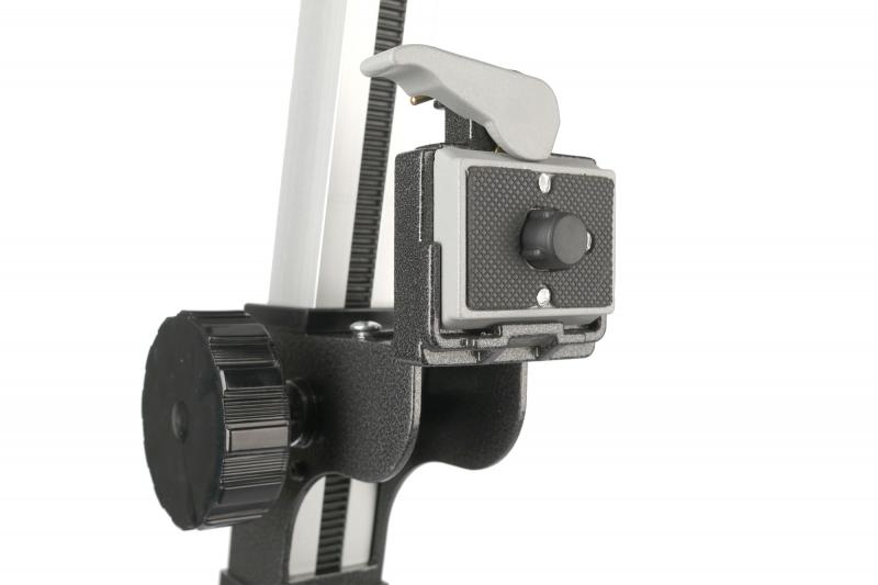 Fotobestway CS-102 reproställ är ett stabilt reprostativ för dig, som vill fotografera av negativ, dia, fotografier (ex. gamla släktbilder), planritningar, skisser, kartor, tavlor, böcker mm.. Om man köper till ett ljusbord, så kan man använda reprostativet även för avfotografering av negativ och diafilm. Fördelen med att använda Fotobestway CS-102 reprostativ är att kameran och bilden (eller negativet) hamnar parallellt , så att man undviker parallax- och skärpefel. Fotobestway CS-102 har ett praktiskt snabbfäste, som gör det möjligt att snabbt montera på eller av kameran från reprostället. Höjden justeras genom att man vrider på den stora ratten på släden på pelaren. På slädens baksida finns en låskrsuv, som gör det möjligt att låsa höjden. (Med kameran fullt upphissad på reprostället, så kan man med en 18mm optik plåta av ett A2-papper med lite marginal.)