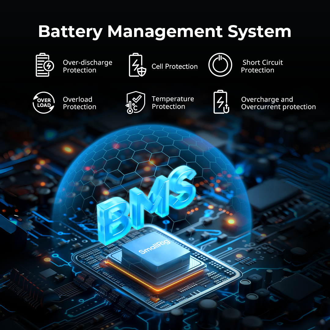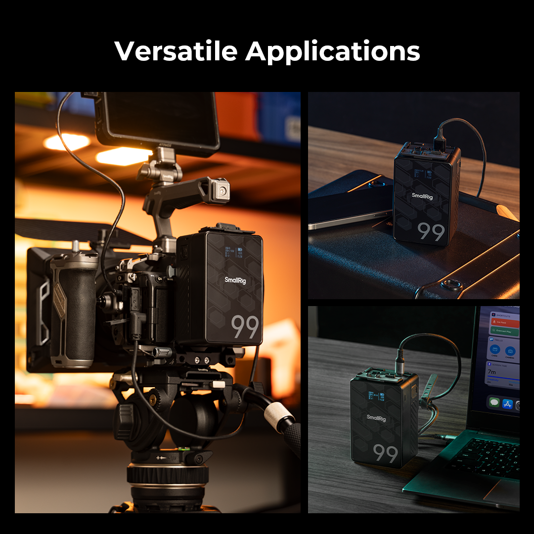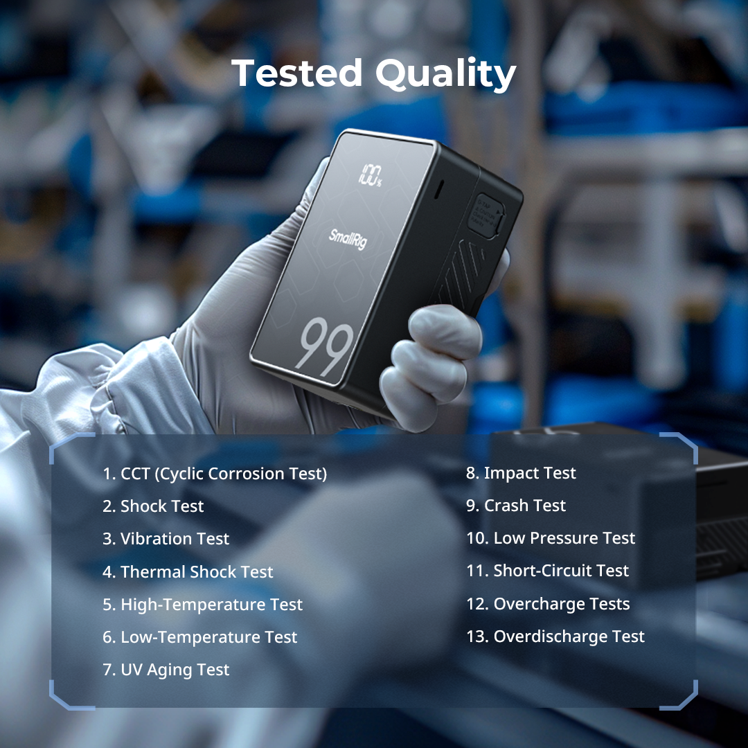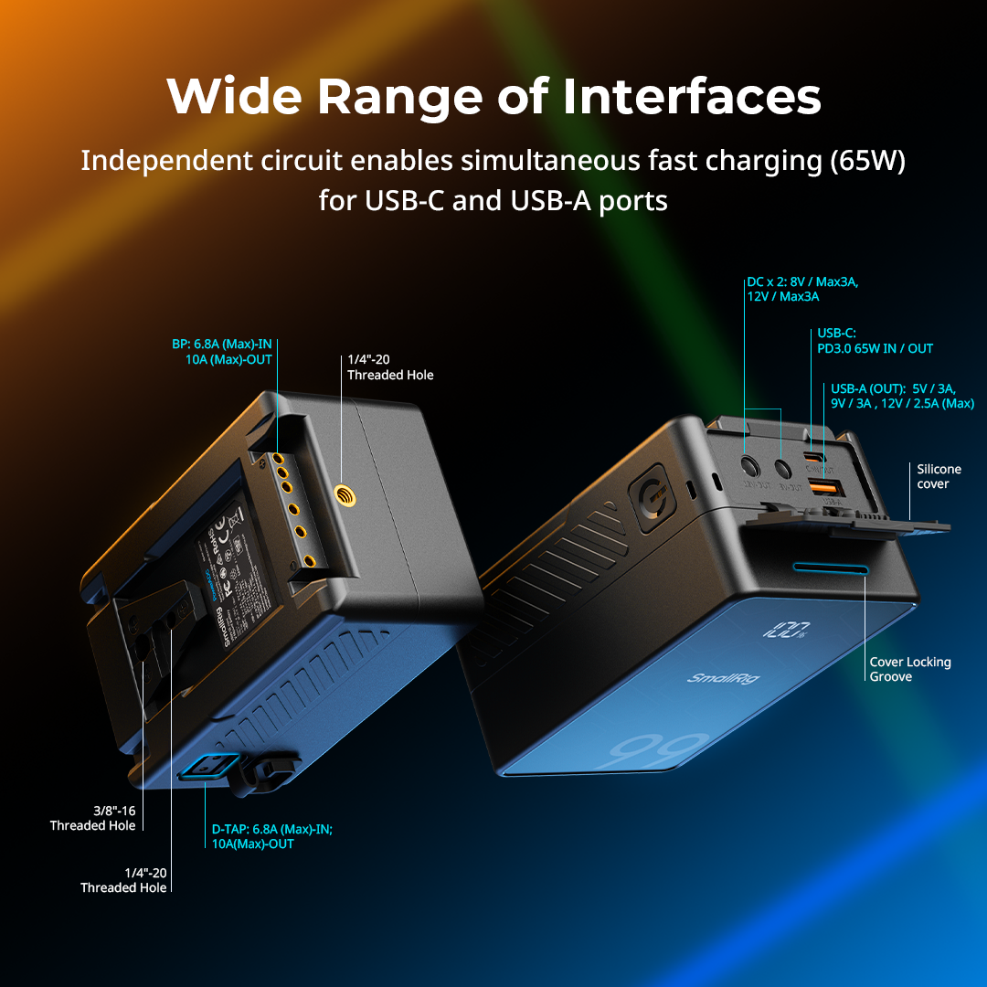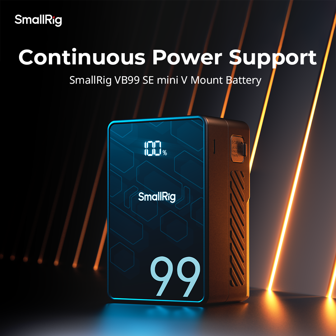 SmallRig 4608 V-Mount Batteri Mini VB99 SE är ett uppladdningsbart och kompakt V-mount batteri, med LG-A 18650 battericeller för hög prestanda och exceptionell stabilitet. Batteriet använder modern MCU-teknologi och stöder olika snabbladdningsprotokoll som PD, QC och PPS och möjliggör 65 W dubbelriktad PD-snabbladdning via USB-C. Kapaciteten på batteriet är 6800mAh, vilket motsvarar 99Wh. Batteriet är utrustad med en BP (V-mount), en D-Tap, en 8V-OUT DC, en 12V-OUT DC, en USB-C och en USB-A-port vilka gör det möjligt att strömförsörja en eller flera enheter samtidigt. Batteriet kan strömförsörja t.ex kompatibla belysningar, (t,ex Godox ML100Bi), kameror, bildskärmar, sändare, videolampor, smartphones, surfplattor, bärbara datorer. Batteriet kan laddas med en 16,8V D-TAP-laddare, USB-C-laddare eller GaN-laddare med PD-snabbladdningsteknik (upp till 65W). Laddare ingår ej. Batteriet har en OLED-skärm, som tydligt visar batterinivå, återstående användningstid, spänning, effekt och annan information, så att du kan övervaka batteristatusen noggrant. Batteriet är utformat för att uppfylla internationella standarder som MSDS / UN38.3 / IEC 62133 / UL2054 / UL 62368 och erhållit certifieringar inklusive FCC / CE / RoHS / ISED / RCM / PSE / KC, vilket garanterar säker och pålitlig drift för användarna. Batteriet har t,ex ett integrerat batterihanteringssystem (BMS) som skyddar mot t.ex överström, kortslutning, övertemperatur och överspänning.