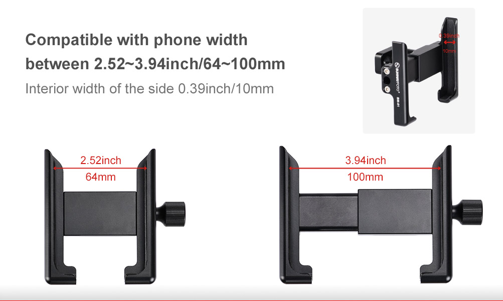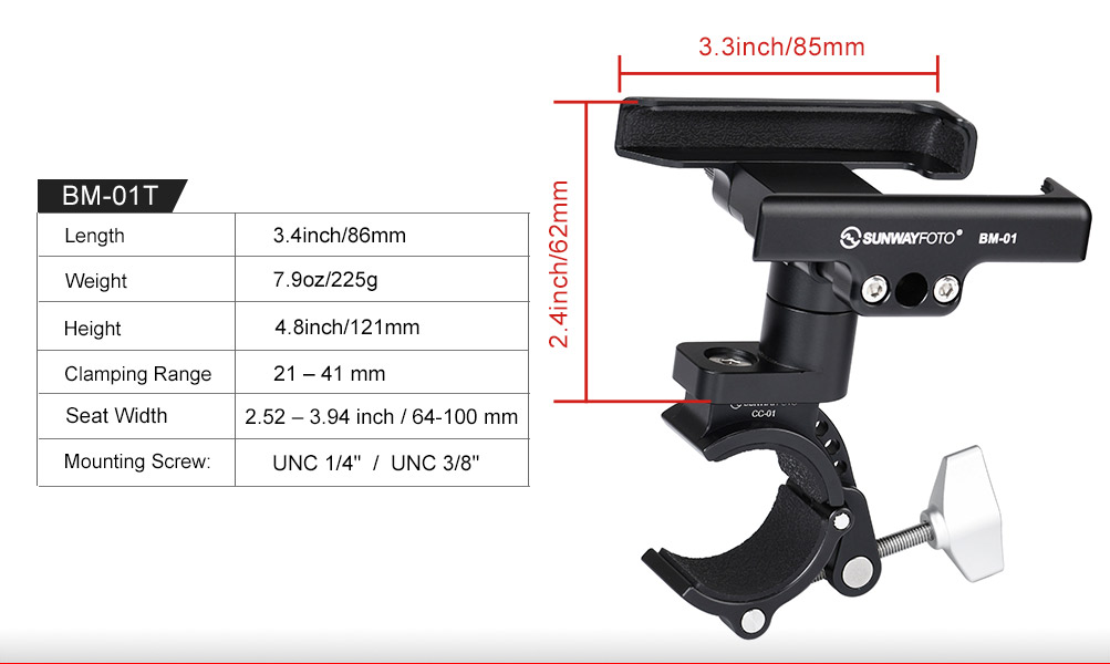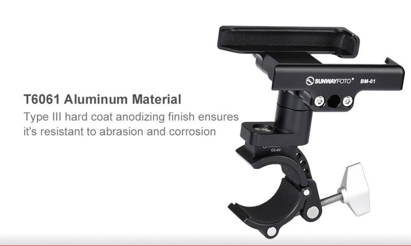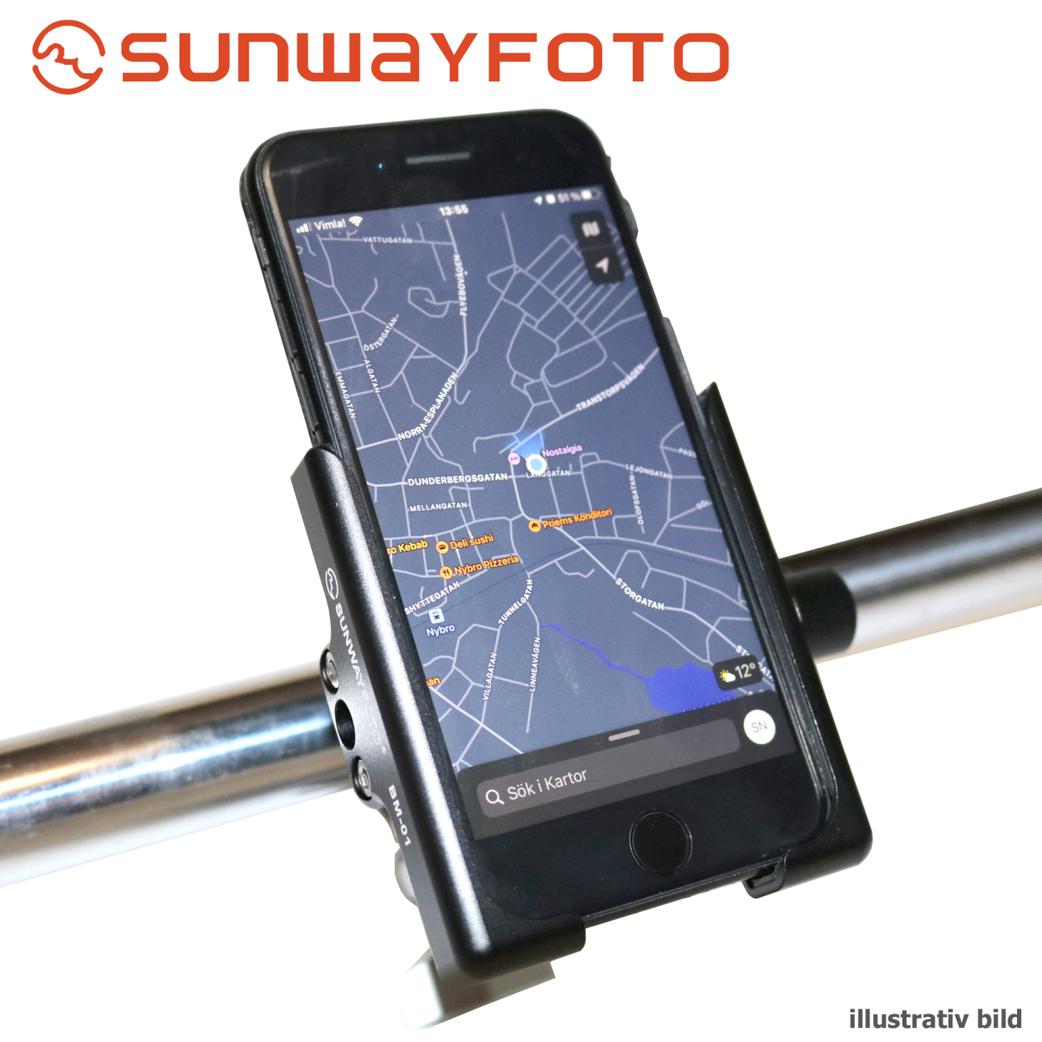 Sunwayfoto BM-01T Cellphone Mount är en vridbar och smidig mobilhållare ( i T6061 aluminium) för cykel, MC, ATV, snöskoter, vattenskoter eller andra fordon. Det finns flera praktiska fördelar med att montera sin smartphone på styret, antingen det är en cykel, MC eller ATV. Vid cykelträning så vill man ofta hålla kolla på hastighet, tid, tempo och stigning. Vid körning av MC, ATV eller snöskoter så kan det vara smidigt att kunna köra efter GPS vid navigering eller se på skärmen vem det är som ringer. Sunwayfoto BM-01T är tillverkat i en T6061 aluminiumlegering, med en hårdanodiserad yta (typ III), som uppfyller mycket höga krav på korrosionsbeständighet och hållbarhet.