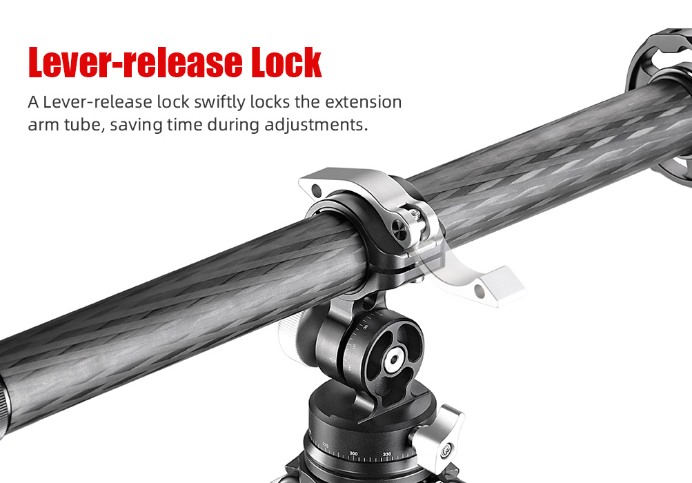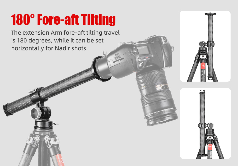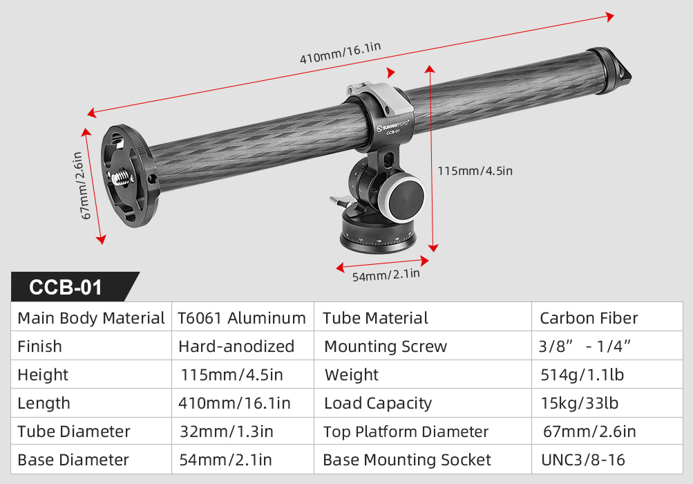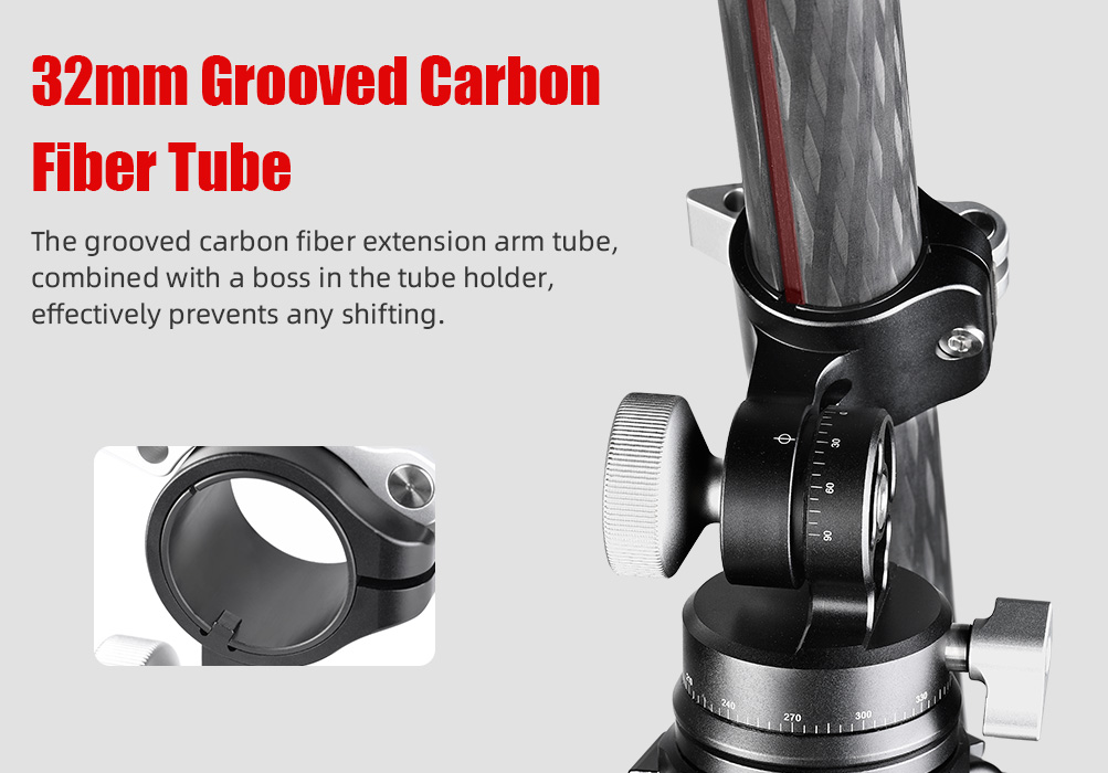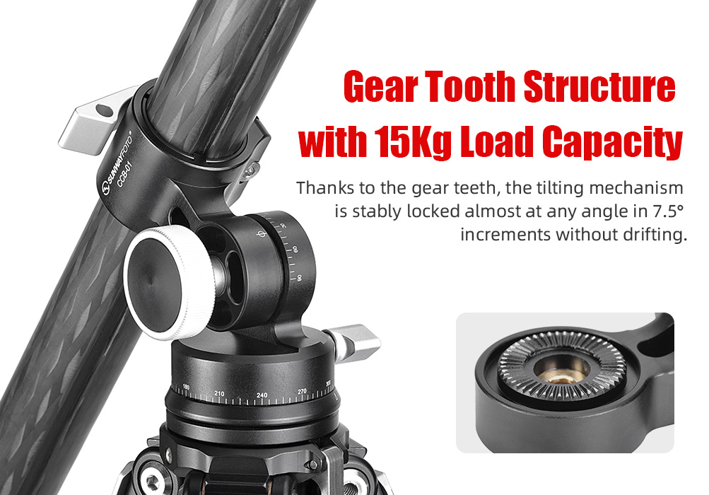 Sunwayfoto® CCB-01 Carbon Fiber Tripod Extension är en tiltbar 410mm mittpelare (med panoramabas) för kamerastativ. Perfekt uppgradering till ditt vanliga kamerastativ, så att du får både högre maxhöjd och möjlighet att luta och panorera mittpelaren för t.ex macro-, studio- och reprofotografering. Tack vare genomtänkt design (7,5° Kugglåsning och grov dimension), så klarar mittpelaren upp till 15Kg i belastning. Röret är tillverkad i Ø32mm superstarkt kolfiber, medan andra detaljer som t.ex tiltlåsningen och panoramabasen är tillverkad i T6061 aluminium för optimal prestanda.