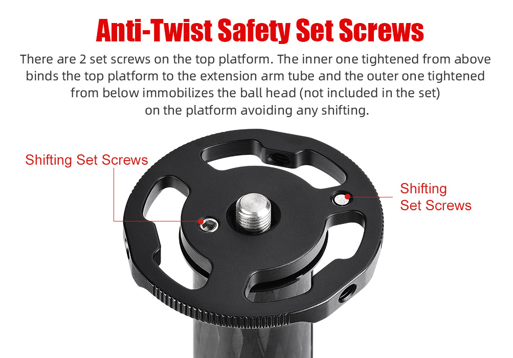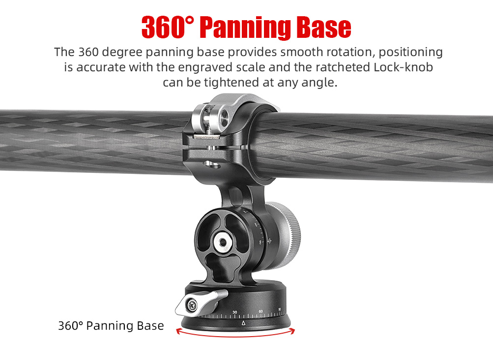 Tiltlåsning (med kuggkonstruktion) gör det möjligt att ställa in vinkeln (lutningen) på mittpelaren i steg om 7,5°. Tack vare kugglåsningen, så klarar mittpelaren upp till 15Kg i belastning. Utdraget av mittpelaren sker snabbt och smidigt via en låsspak. Panoramabasen gör det möjligt att rotera basen 360°. På undersidan av panoramabasen finns standard 3/8" gänga (Fyllnadsskruv 1/4" gänga medföljer). På ena änden av mittpelaren finns en Ø67mm kameraplattform (med vändbar skruv med 1/4" och 3/8" gänga) och i den andra änden en krok. Kroken används för att hänga på t.ex en motvikt.