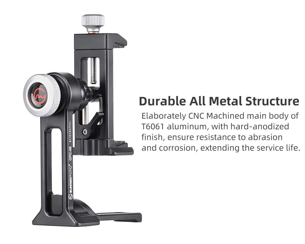 Sunwayfoto® CPC-06 Mobile Phone Bracket/ Stand är förmodligen marknadens bästa smartphone-hållare! CPC-06 är en Arca-swiss kompatibel och roterbar universalhållare för smartphone, som är tillverkad i T6061 aluminiumlegering, med en hårdanodiserad yta, som i princip uppfyller militära specifikationer på korrosionsbeständighet och hållbarhet. Fästet är försedd med standard 1/4" kameragänga (för t.ex montering på stativ) och Dovetail-spår för montering i ett Arca-Swiss kompatibelt snabbfäste! Dessutom kan man fälla ut en aluminiumfot, som gör det möjligt att ställa mobilhållaren på t.ex ett bord. Det följer även med blixtfot i metall som gör det möjligt att montera hållaren i en standard blixtsko.