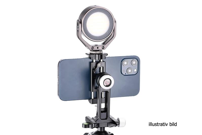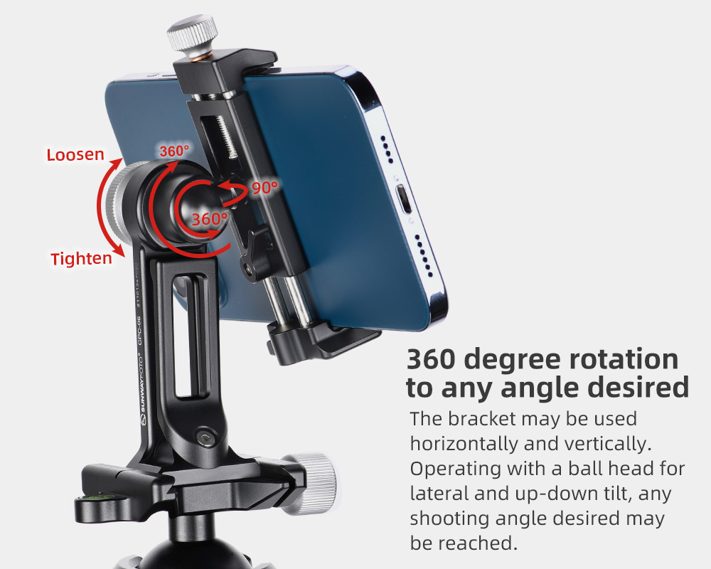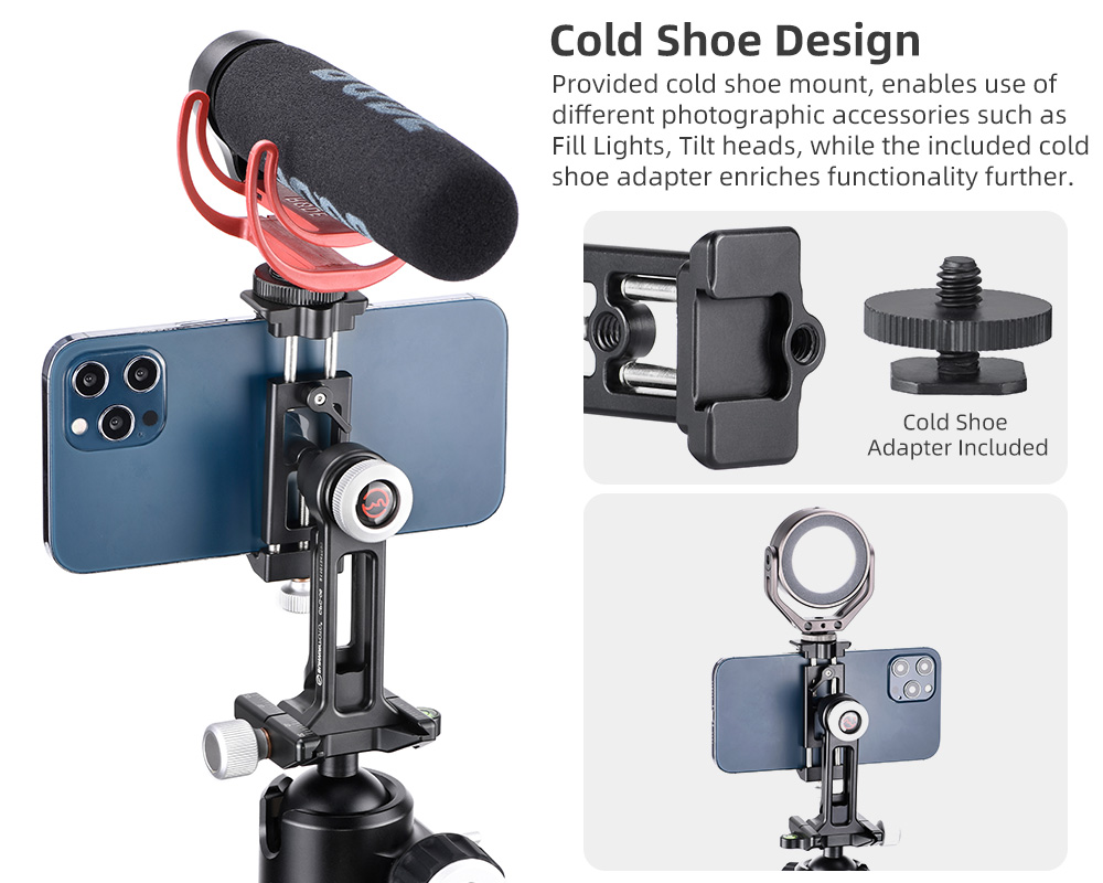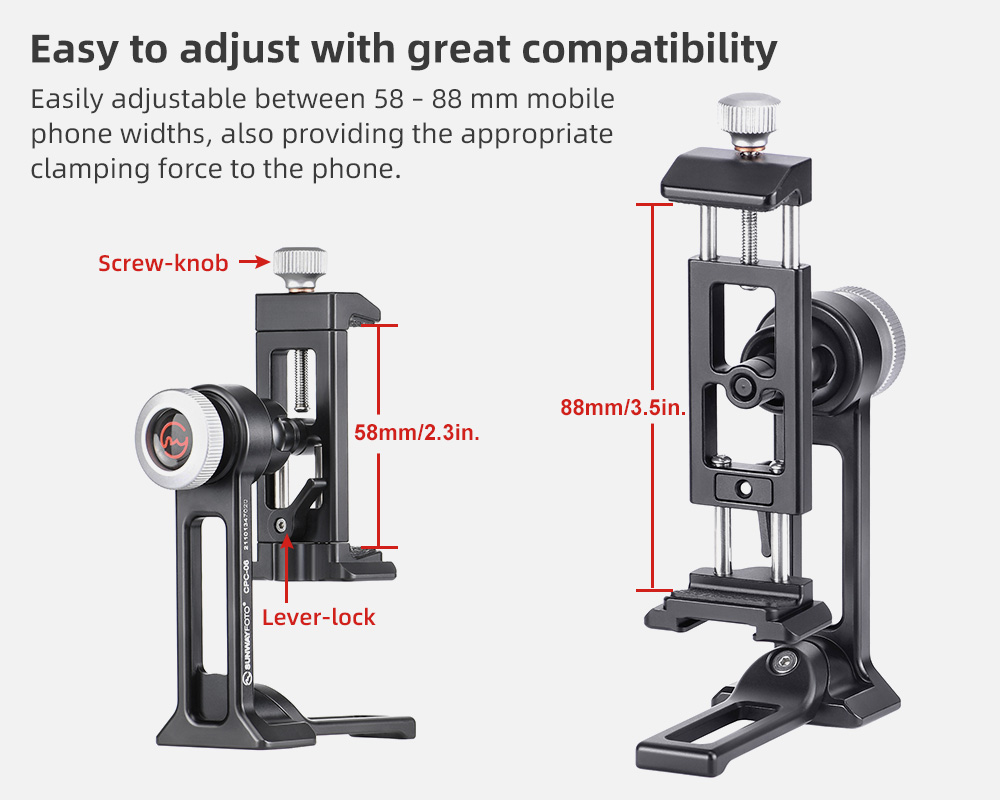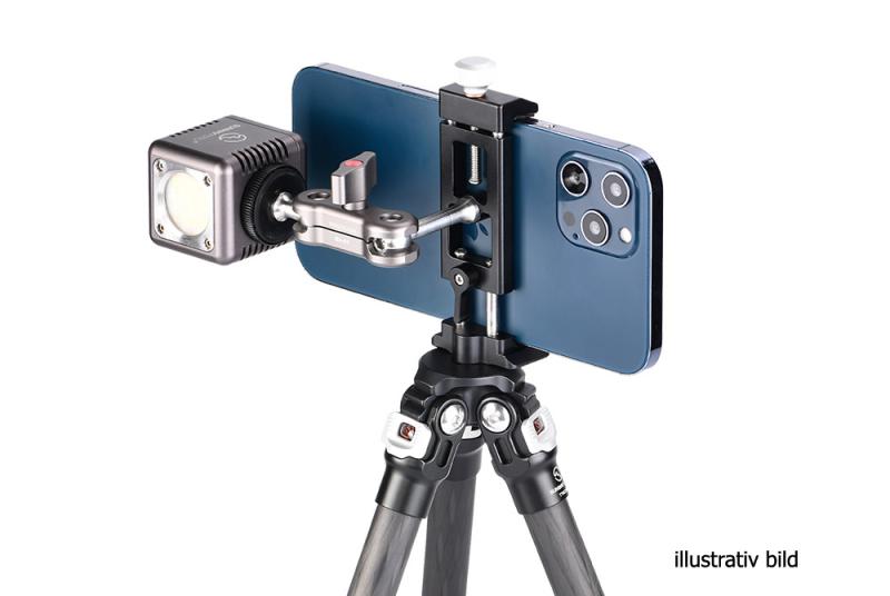 Tack vare kulleden (med urtag och separat låsning) på baksidan av fästet, så kan man vrida och luta mobiltelefonen. Perfekt att använda vid Skype- och Zoom-samtal. Klämman som låser mobilen är utdragbar åt två håll, på ena sidan finns en låsratt och på baksidan ett låsvred. Detta är en Sunwayfoto produkt, så den håller extremt hög kvalitè och finish. Hållaren har gummerade anläggningsytor för att inte repa din mobiltelefon och ställbar gripvidd (58-88mm) för att passa de flesta smartphones på marknaden. På hållaren finns en standard blixtsko för t.ex montering av en extern mikrofon vid filmning. Tack vare CPC-06 har begåvats med en modulär design, så kan man plocka bort det roterbara fästet och montera mobilklämman direkt på t.ex på ett Arca-Swiss kompatibelt snabbfäste eller på t.ex en kulled, selfiepinne eller annat tillbehör med standard 1/4" gänga.