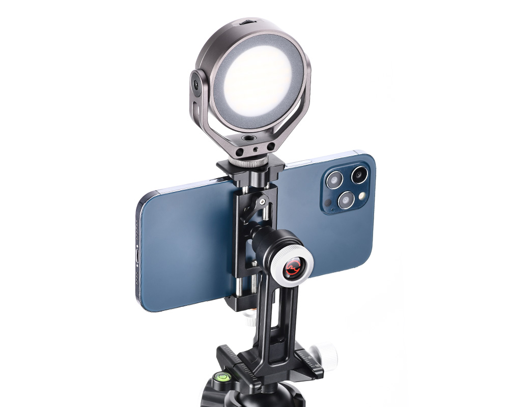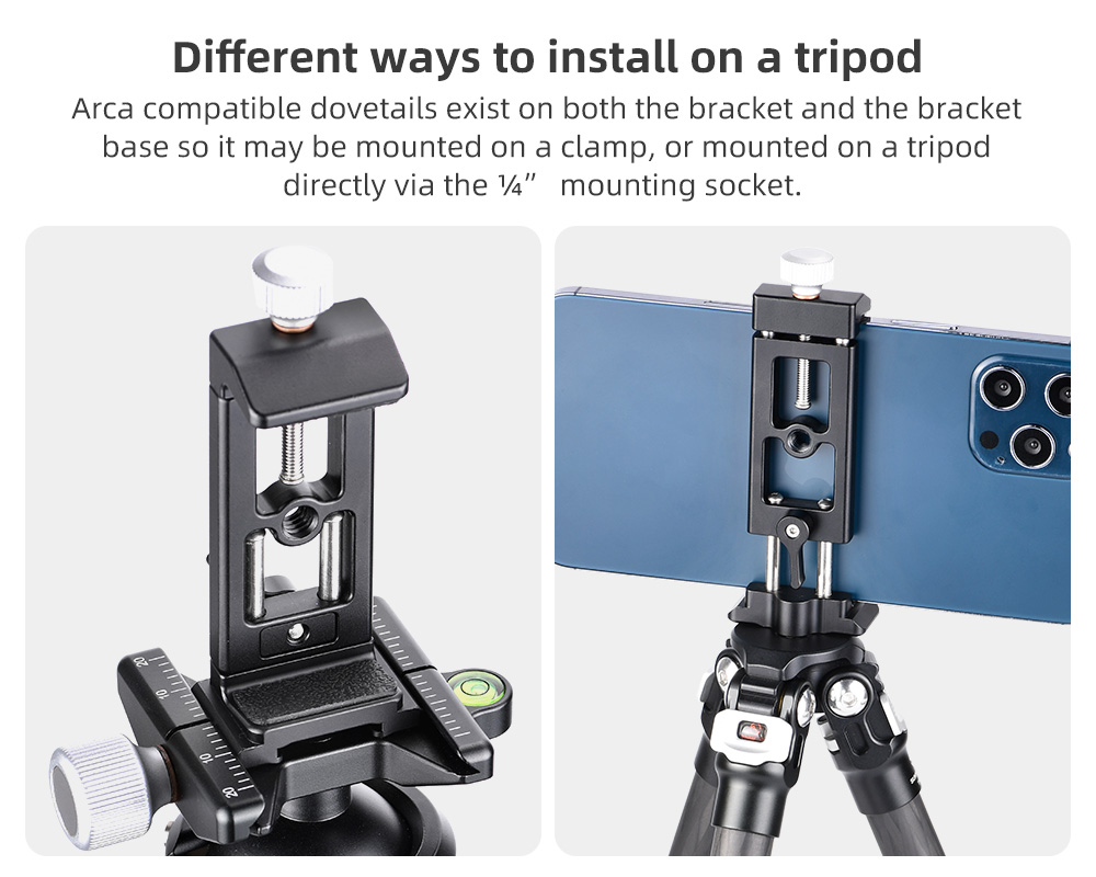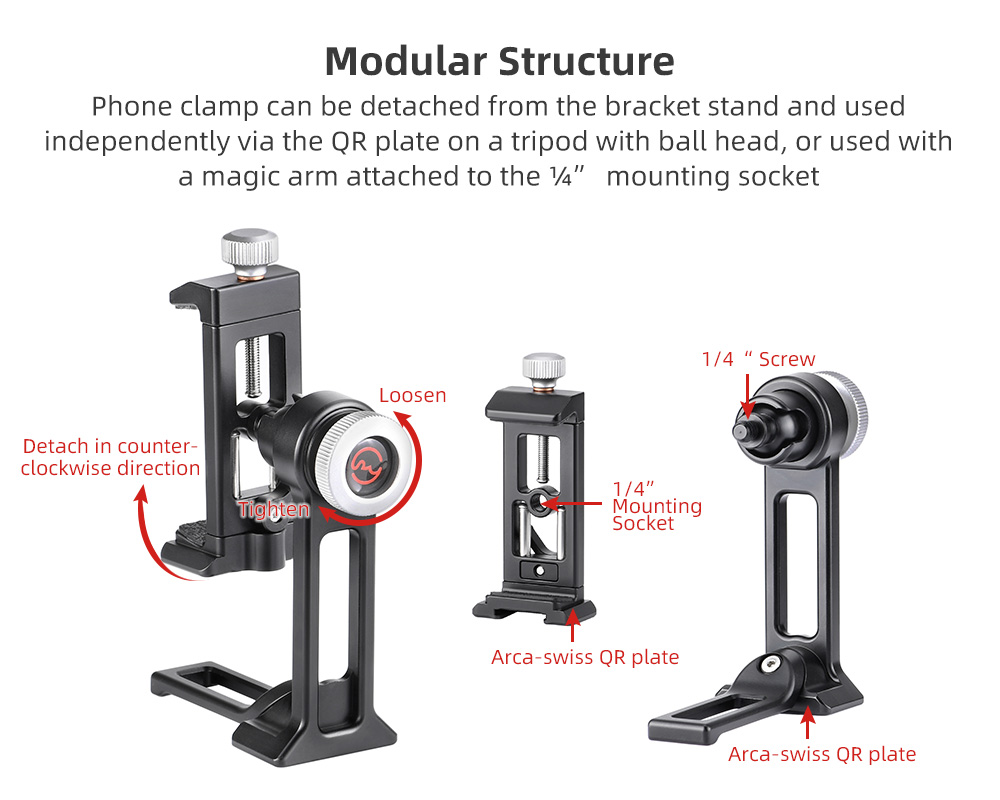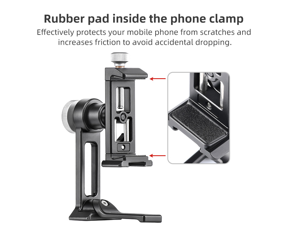 Tack vare kulleden (med urtag och separat låsning) på baksidan av fästet, så kan man vrida och luta mobiltelefonen. Perfekt att använda vid Skype- och Zoom-samtal. Klämman som låser mobilen är utdragbar åt två håll, på ena sidan finns en låsratt och på baksidan ett låsvred. Detta är en Sunwayfoto produkt, så den håller extremt hög kvalitè och finish. Hållaren har gummerade anläggningsytor för att inte repa din mobiltelefon och ställbar gripvidd (58-88mm) för att passa de flesta smartphones på marknaden. På hållaren finns en standard blixtsko för t.ex montering av en extern mikrofon vid filmning. Tack vare CPC-06 har begåvats med en modulär design, så kan man plocka bort det roterbara fästet och montera mobilklämman direkt på t.ex på ett Arca-Swiss kompatibelt snabbfäste eller på t.ex en kulled, selfiepinne eller annat tillbehör med standard 1/4" gänga.
