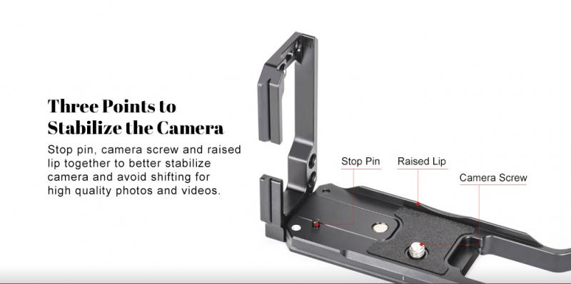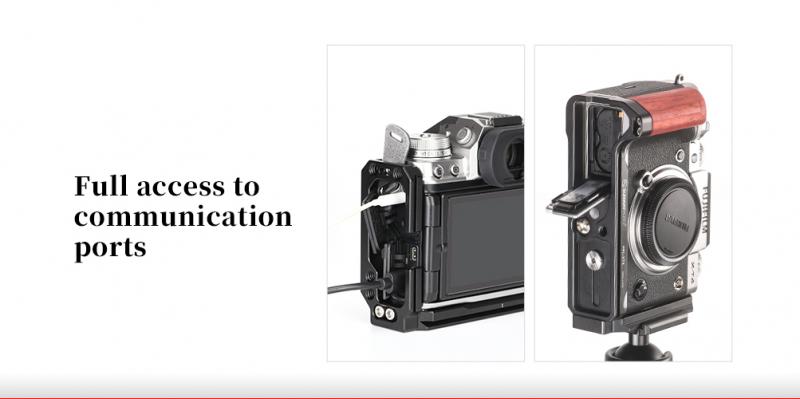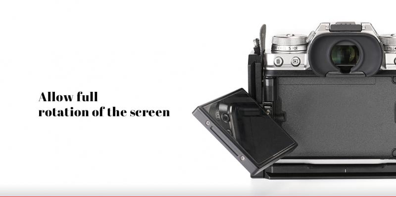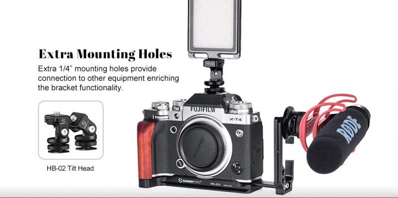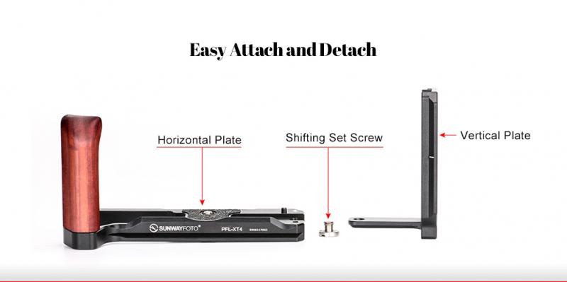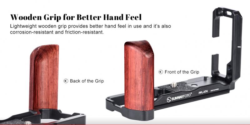 Sunwayfoto® PFL-XT4 är en Arca-Swiss kompatibel L-fäste med kameragrepp (grip) för Fujifilm X-T4. Fästet är specialdesignat för Fujifilm X-T4, så att man får perfekt passform och bekvämt grepp (trä) när man håller i kameran. L-fästet gör det möjligt att t.ex snabbt växla från landskap- till höjdformat när man fotograferar. PFL-XT4 är en specialdesignad L-Bracket för Fujifilm X-T4, så att man får perfekt passform på L-fästet och smidig tillgång till uttagen för fjärrkontroll och datakablar, batteri mm. L-fästet är även försedd med en stödkant (på framsidan), som ser till att kameran inte kan vrida sig. Det är även möjligt att ställa in och anpassa avståndet till den vertikala plattan. Till skillnad från universalfästen, så har L-fästet anpassad design efter kameran som gör det möjligt att t.ex rotera skärmen obehindrat.