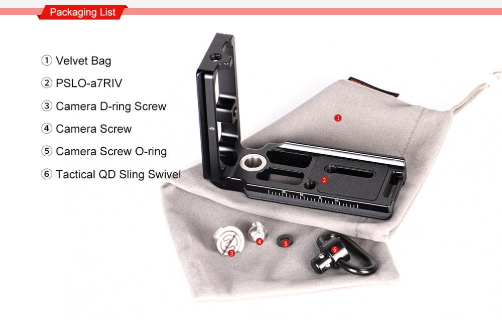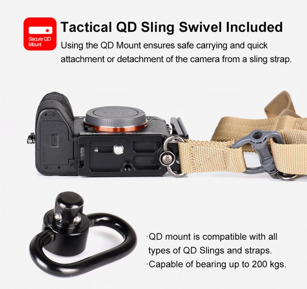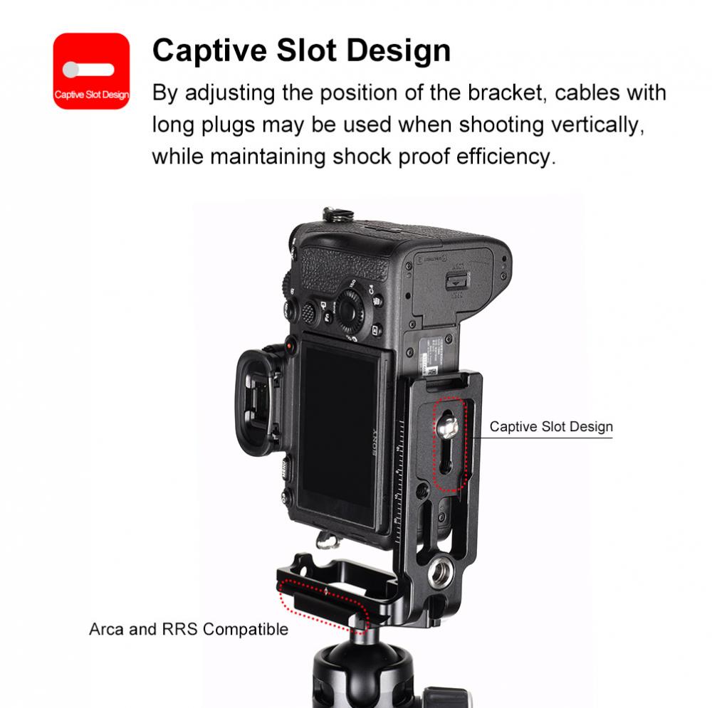 L-fästet är även försedd med en stödkant (på framsidan), som ser till att kameran inte kan vrida sig. L-fästet är försedd med Arca-Swiss Dovetail spår för montering i Arca-Swiss kompatibla snabbfästen (Snabbfäste ingår ej). På undersidan av kameraplattan finns två stoppskruvar, som kan lossas med insexnyckel. Tack vare att L-fästet har "Captive-Slot"-design, med en kameragänga som löper i ett spår, så kan man ställa in kamerans position i sidled. L-fästet är också försedd med extra 1/4" gängor, som gör det möjligt att bygga ut L-fästet med andra tillbehör som t.ex blixtskofäste. Det följer med ett D-format kamerarems-fäste, med QD Sling Swivel. (Kamerarem ingår ej)