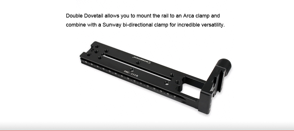 Sunwayfoto® DMC-200R Vertical Rail är ett Arca-Swiss kompatibelt vertikalräls, med dubbla längsgående Dovetail-spår och ett Arca-Swiss kompatibelt snabbfäste, med låsratt.