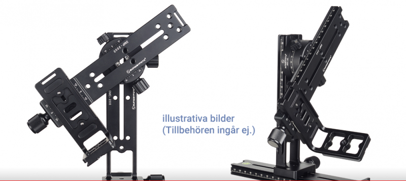 Sunwayfoto® DMP-200R är en 200mm Nodalskena, med dubbla längsgående Dovetail-spår och ett Arca-Swiss kompatibelt snabbfäste, med låsratt. Nodalskenan kan antingen monteras direkt på t.ex en kulled (med 1/4"gänga) eller på ett Arca-swiss kompatibelt snabbfäste. Fördelen med att använda nodalskenan är att man enkelt och med hög precision kan justera kamerans position i sidled (nodalpunkt). Nodalskenan har nämligen lasergraverade millimeter-skalor på långsidorna. Snabbfästet på ovansidan av nodalplattan är naturligtvis också Arca-Swiss kompatibelt, liksom underdelen av kameraskenan. Sunwayfoto® DMP-200R Nodal Slide är tillverkad i anodiserad aluminium, med lasergraverade cm-skalor. På ena kortsidan så finns det en urfräsning, där det är möjligt att fästa t.ex en rem. Det följer även med en standard kameraskruv 1/4", två stycken stoppskruvar och insexnycklar. Sunwayfoto® DMP-200R är en viktig komponent om man vill själv vill konfigurera och bygga ihop ett professionellt panoramasystem, med Arca-Swiss kompatibla tillbehör.