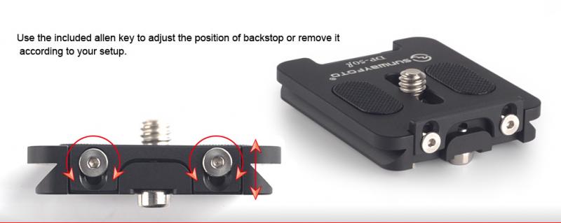 Sunwayfoto® DP-50R är en Arca-Swiss kompatibel kameraplatta (Längd 50mm), med ställbart backstop (kantstöd) för kameran.